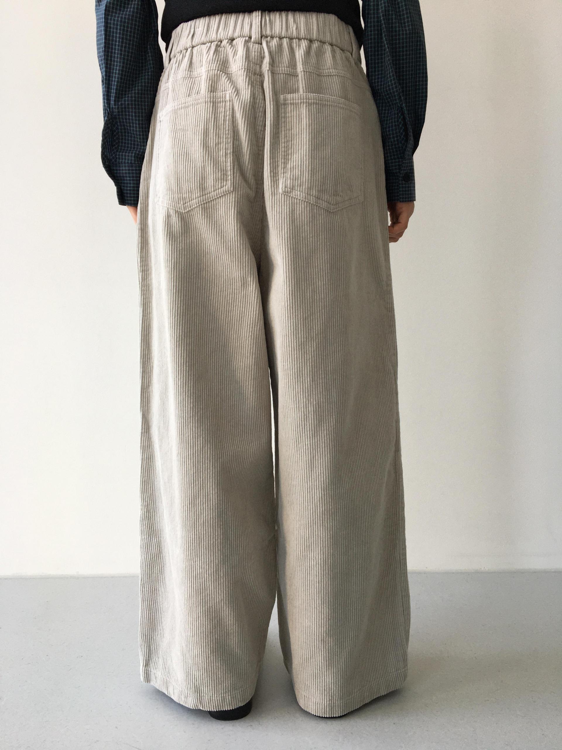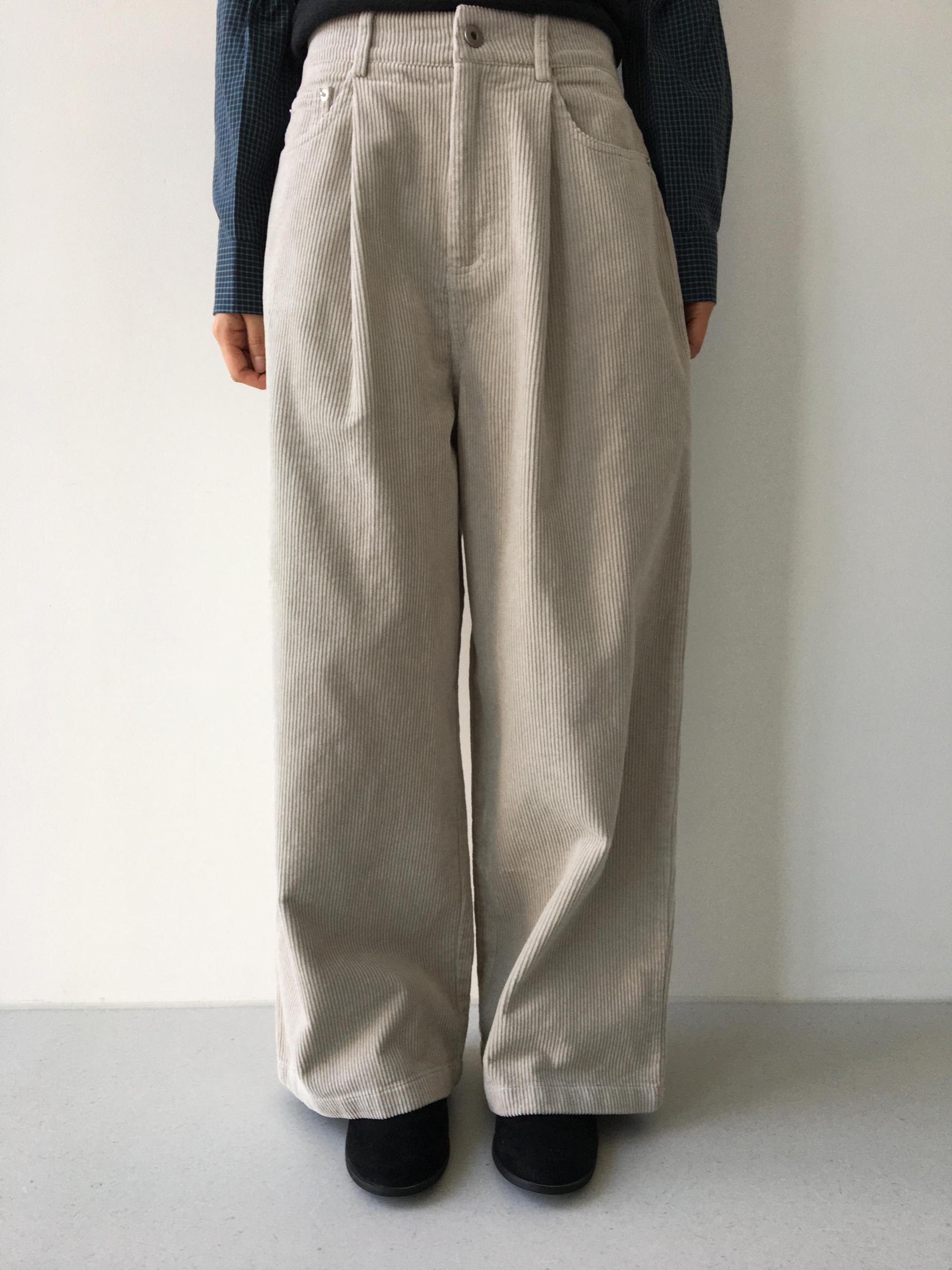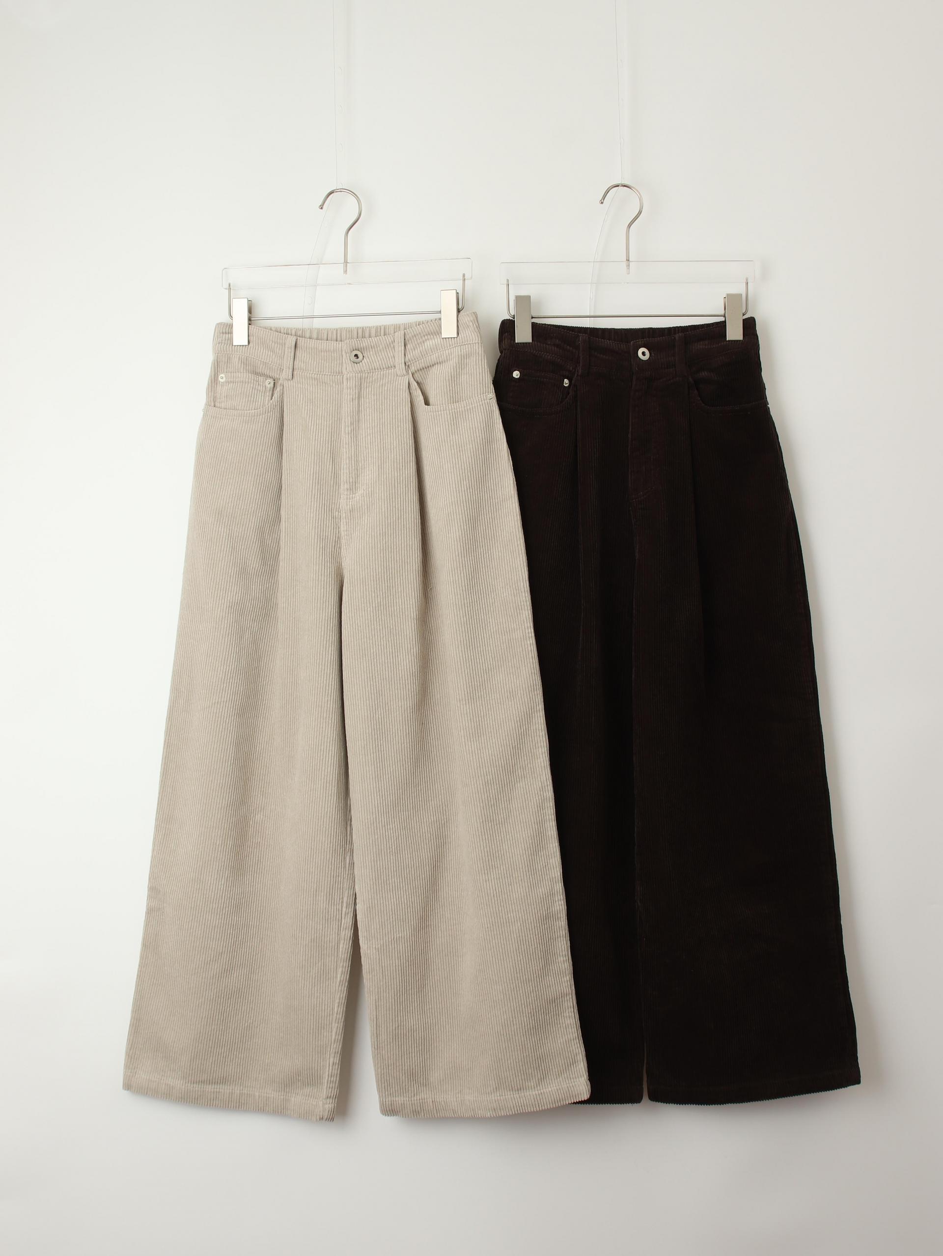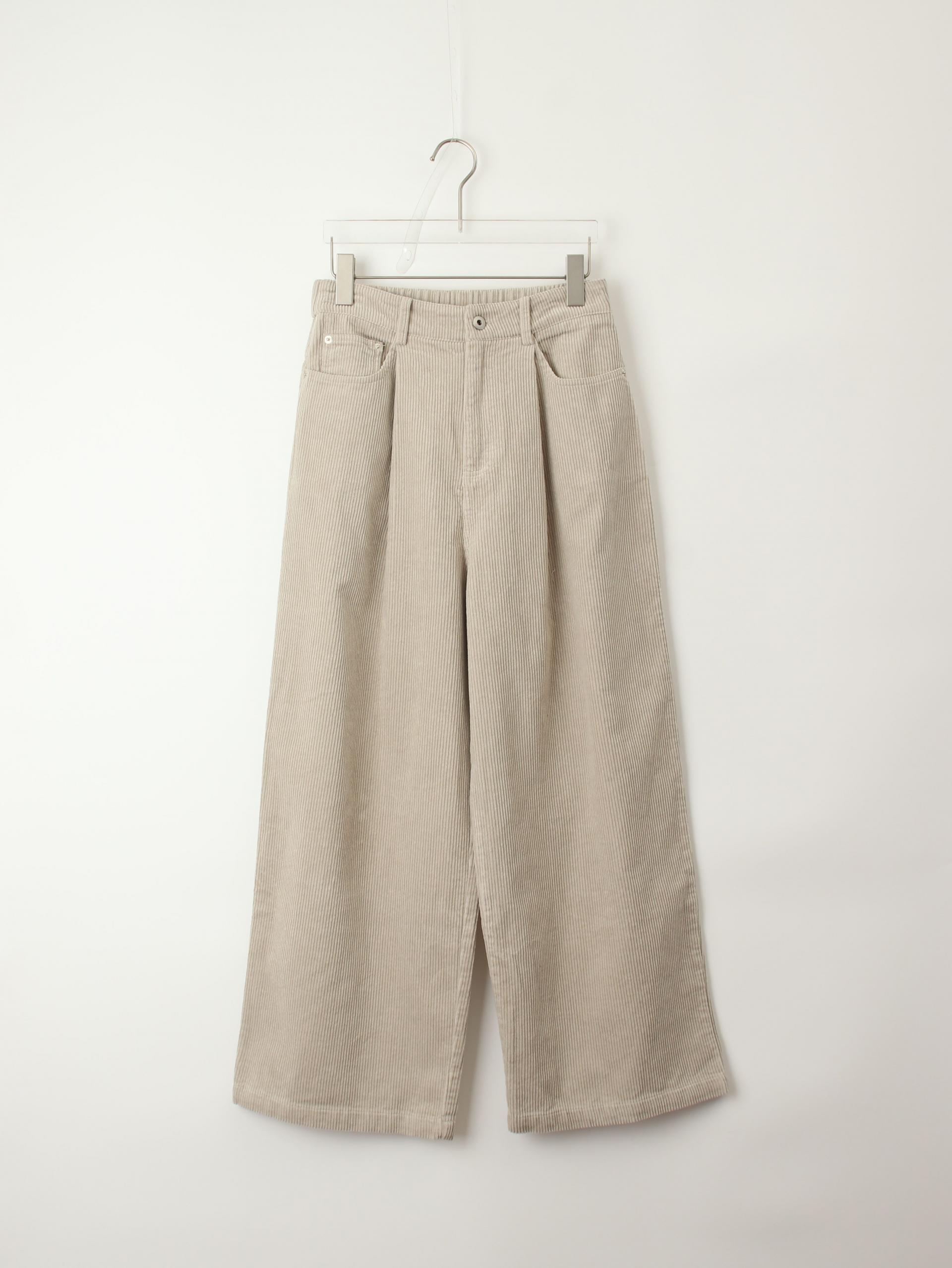 따뜻한 터치감의 두께감있는 코듀로이 소재로 제작된 와이드 팬츠입니다.