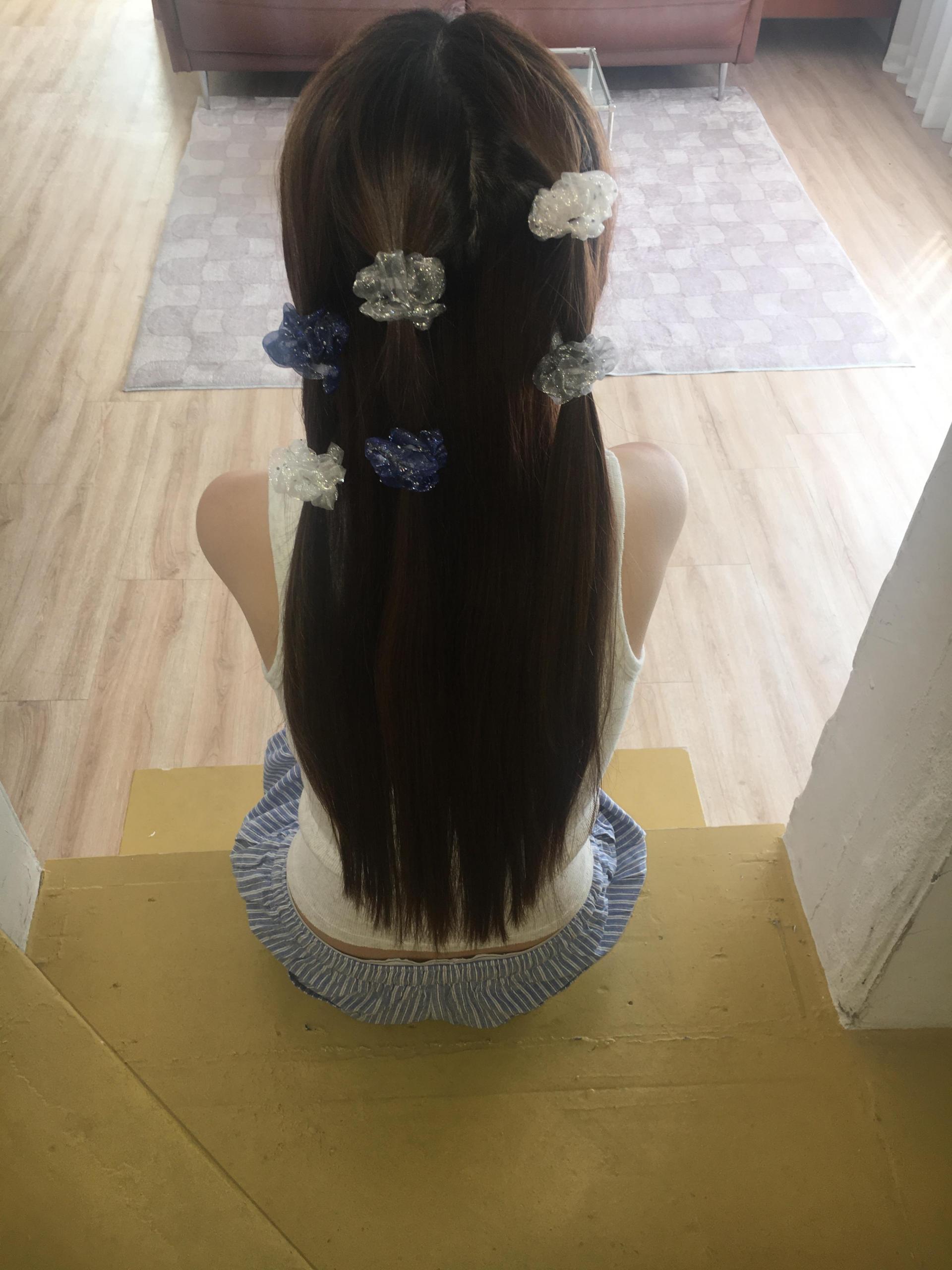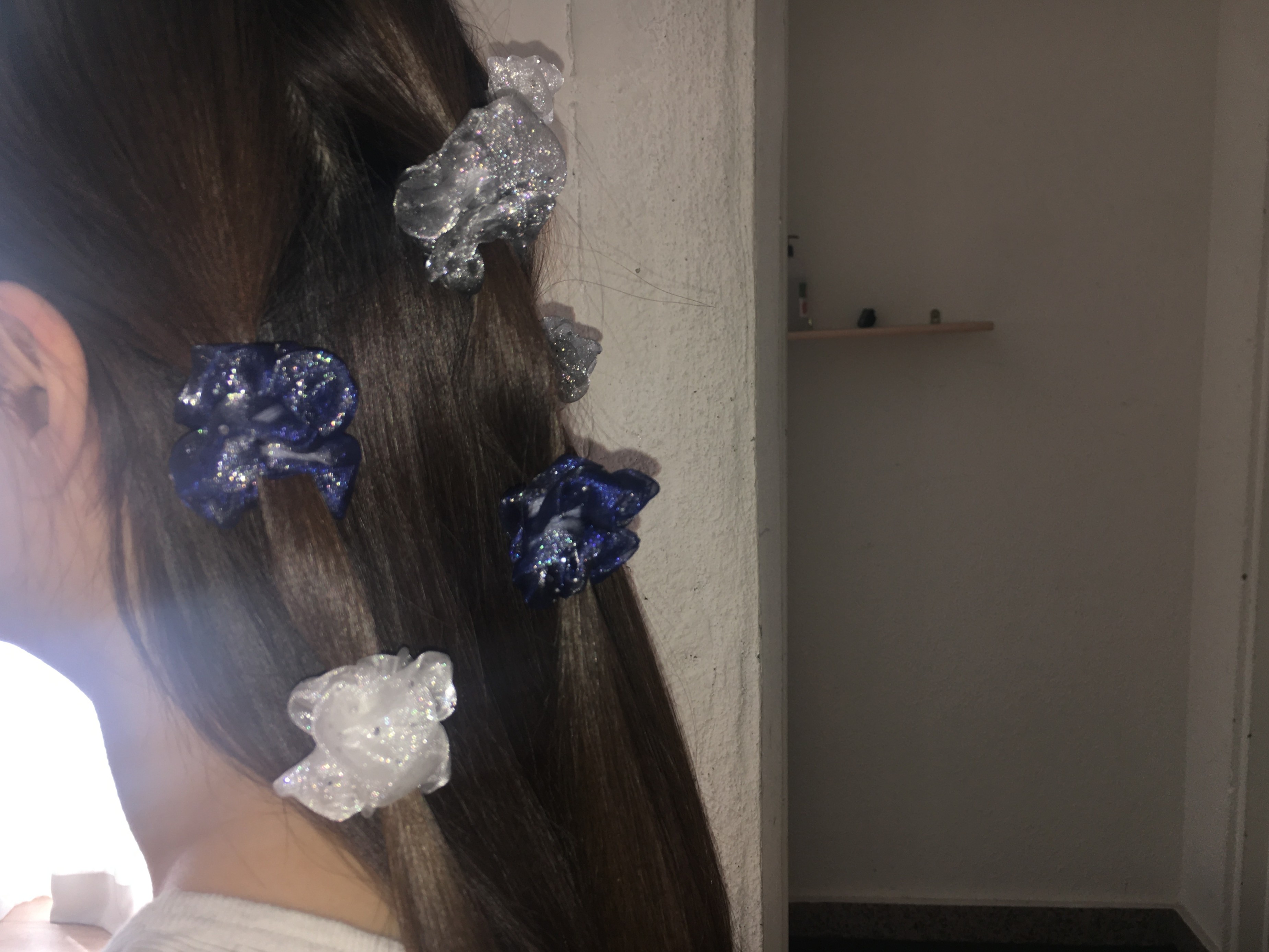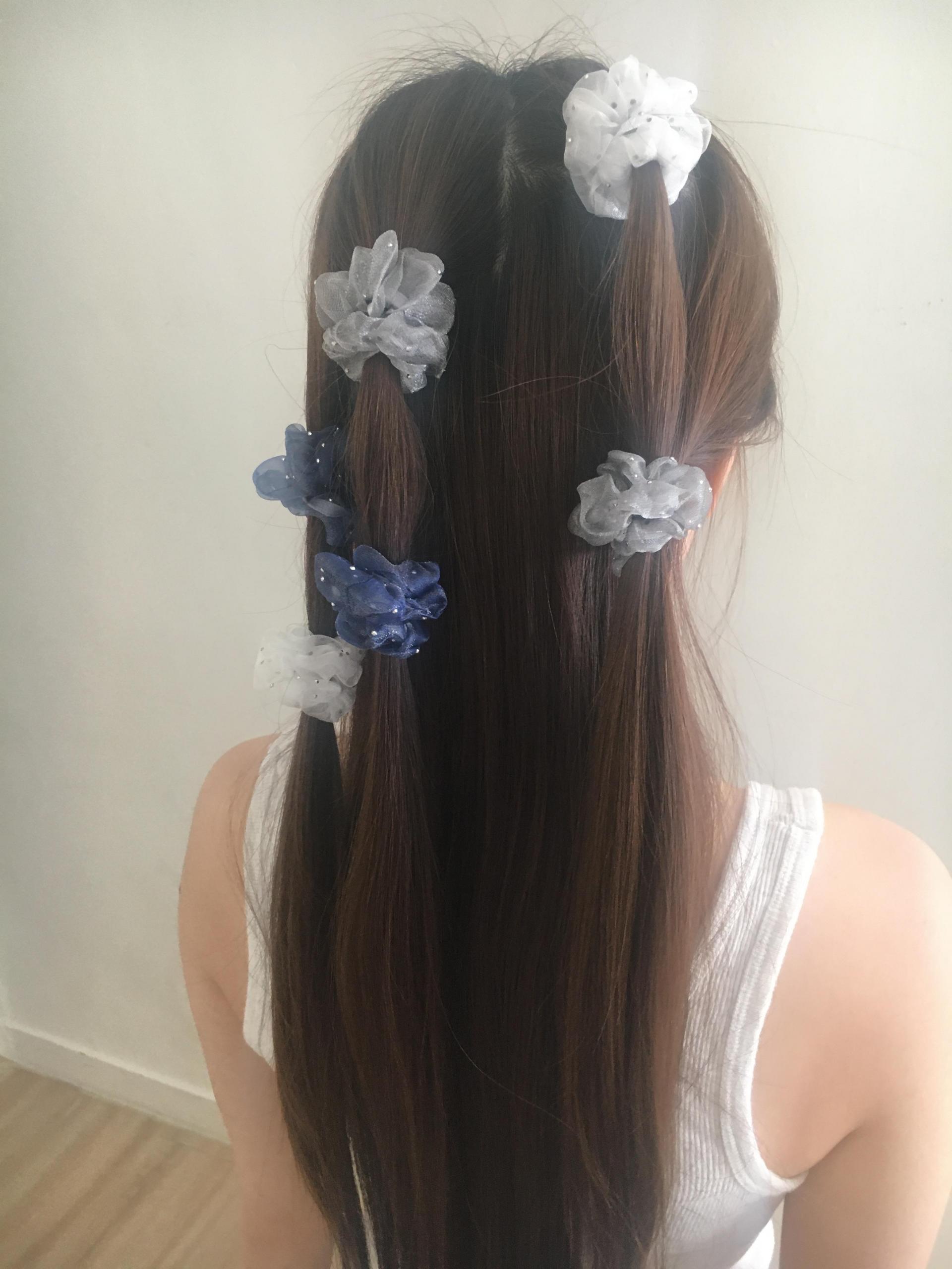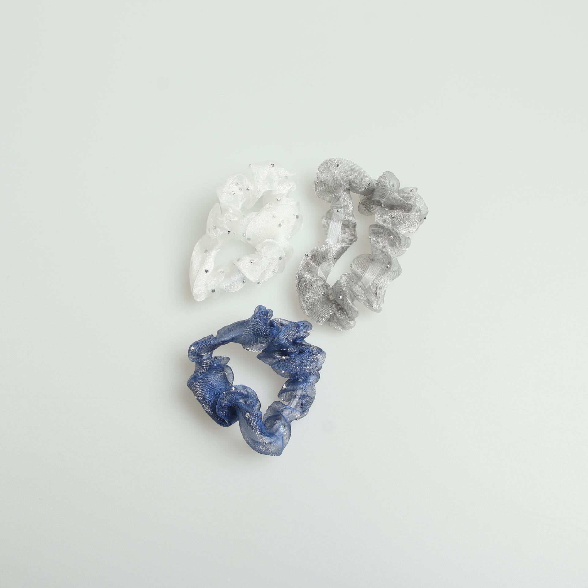 - 실버, 화이트, 블루 세 가지 컬러가 세트로 판매되는 스크런치