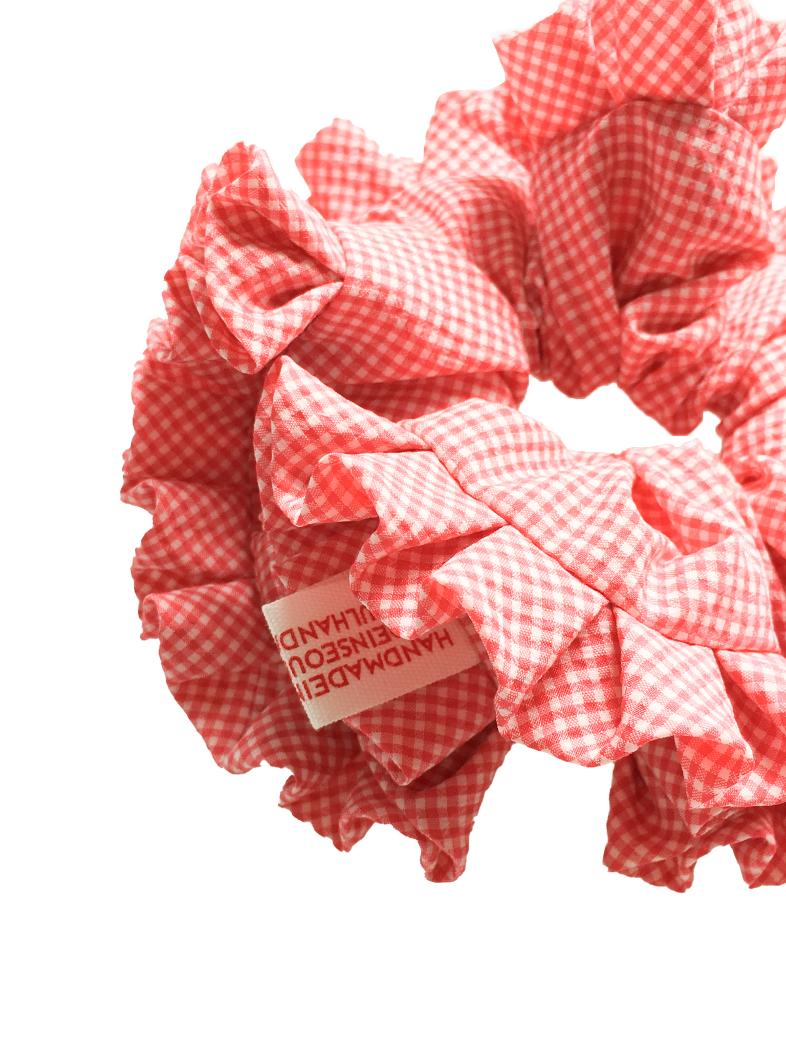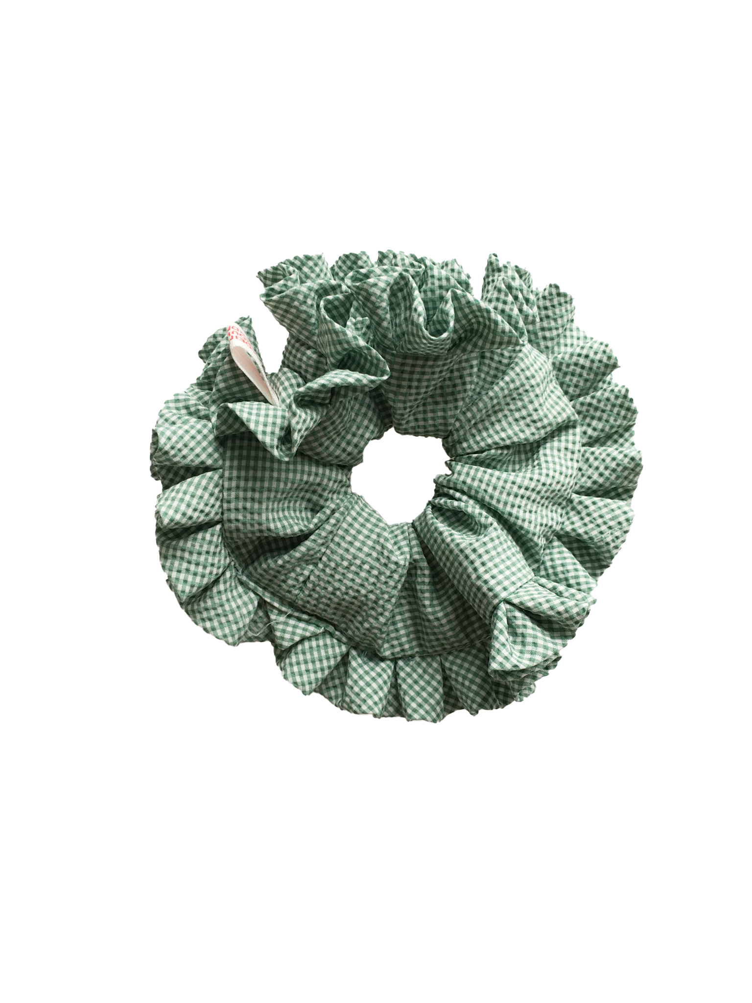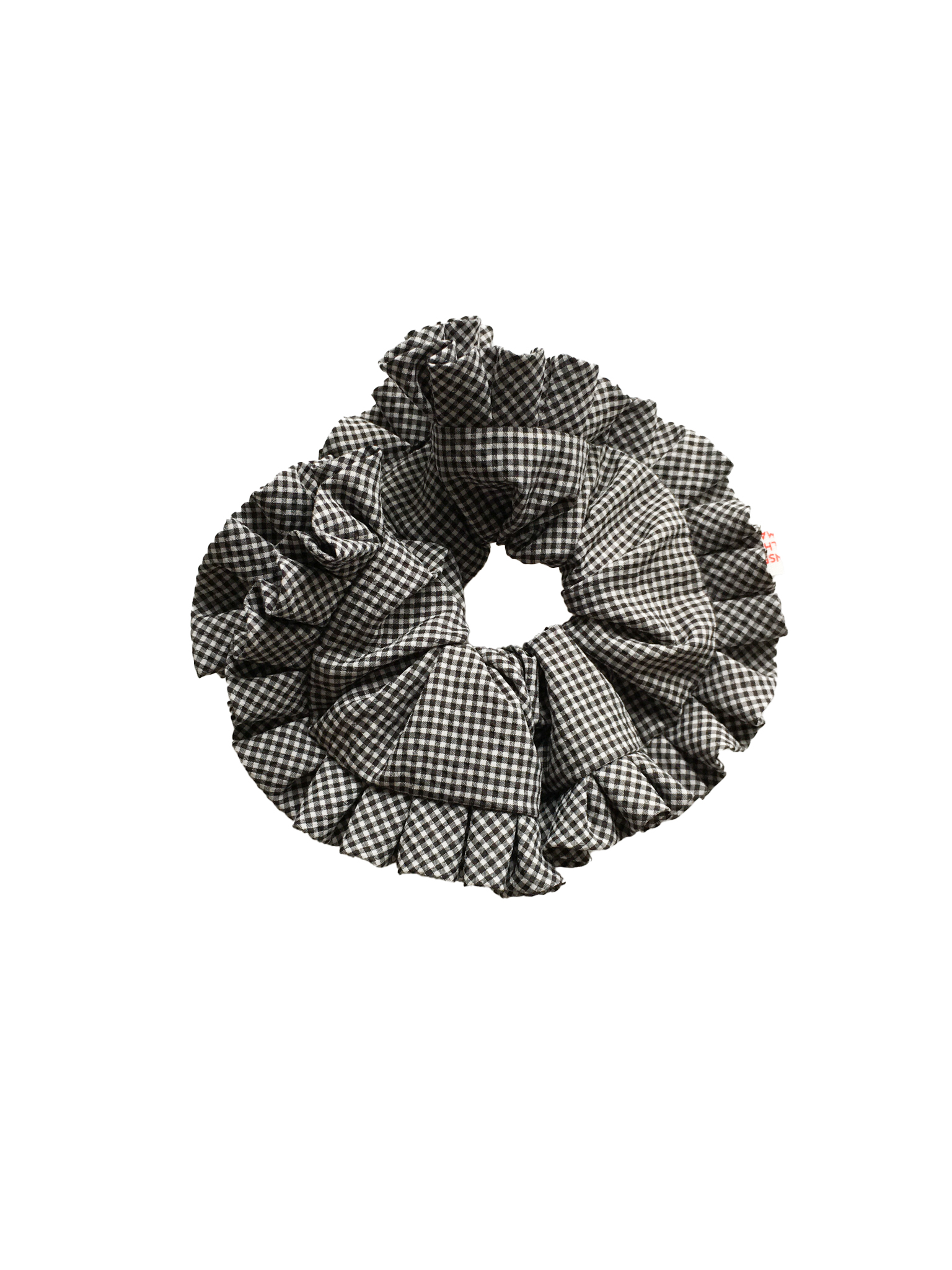 - red, green, blue, black 4가지 색상으로 제작된 체크무늬의 풍성한 프릴 스크런치