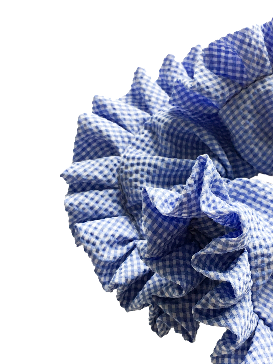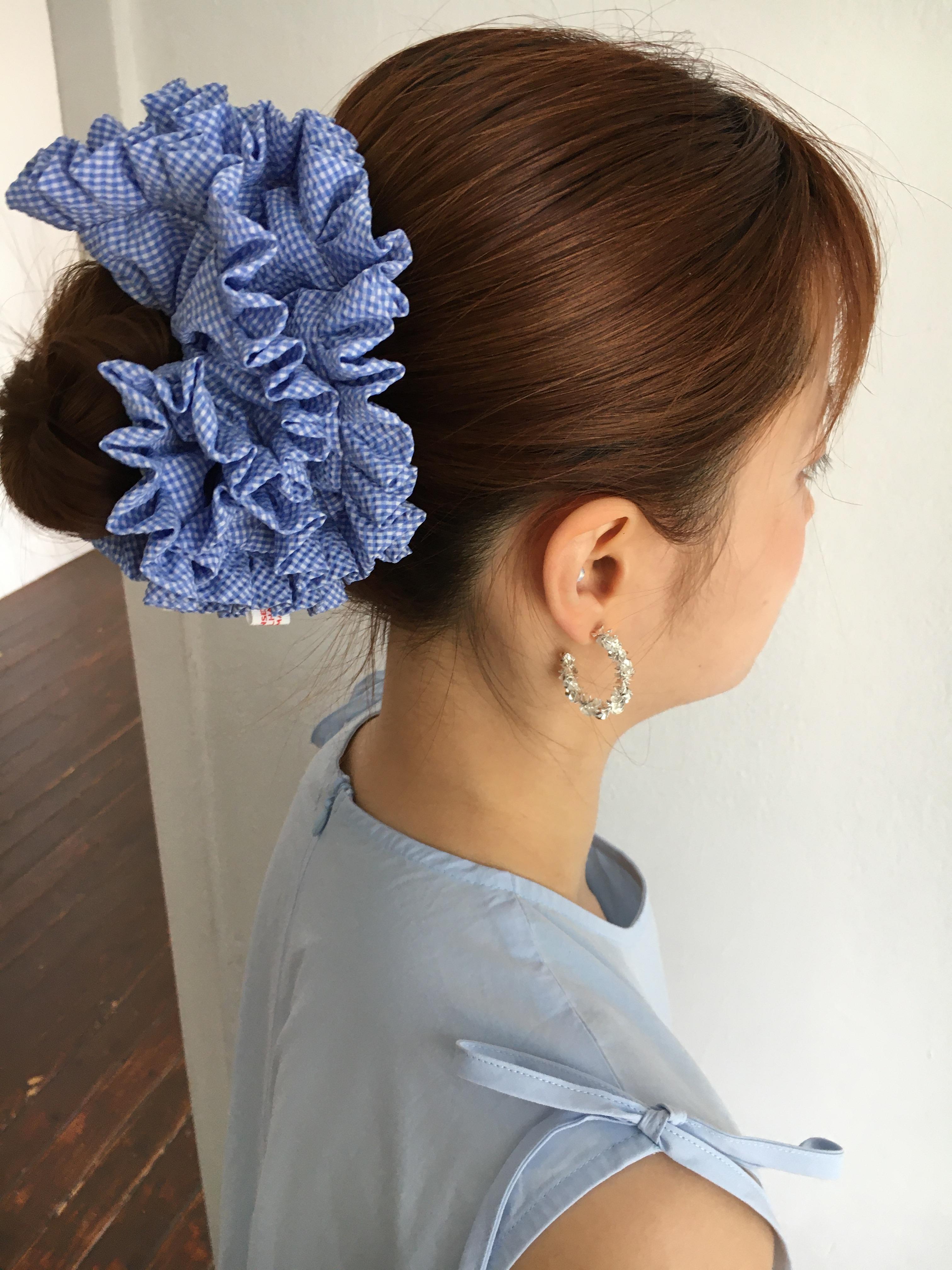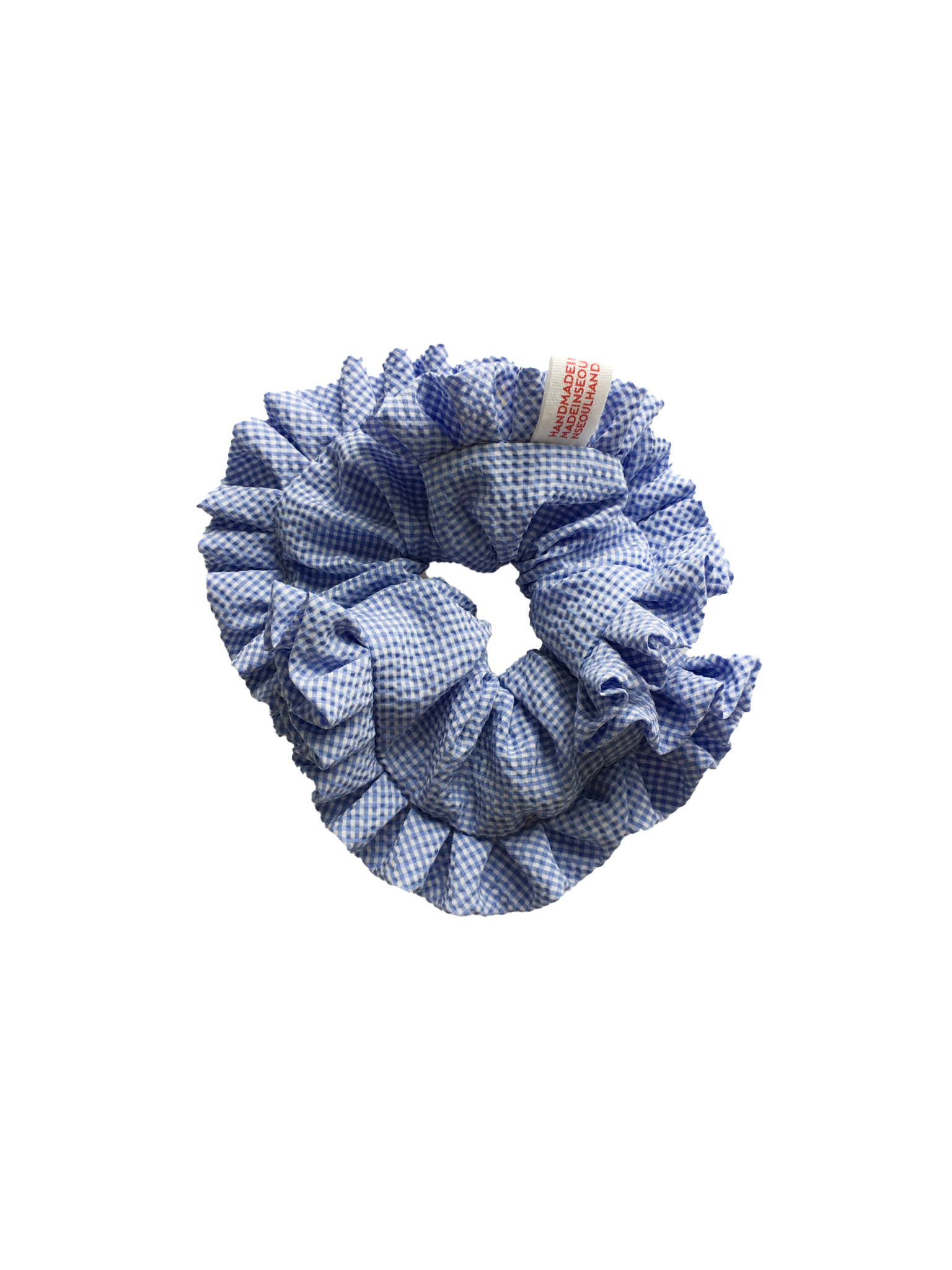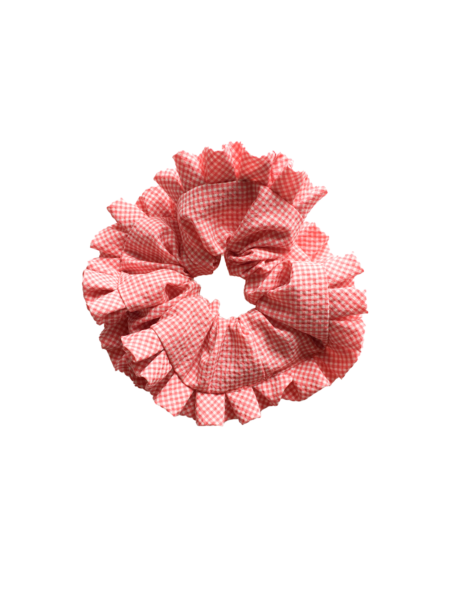 - red, green, blue, black 4가지 색상으로 제작된 체크무늬의 풍성한 프릴 스크런치