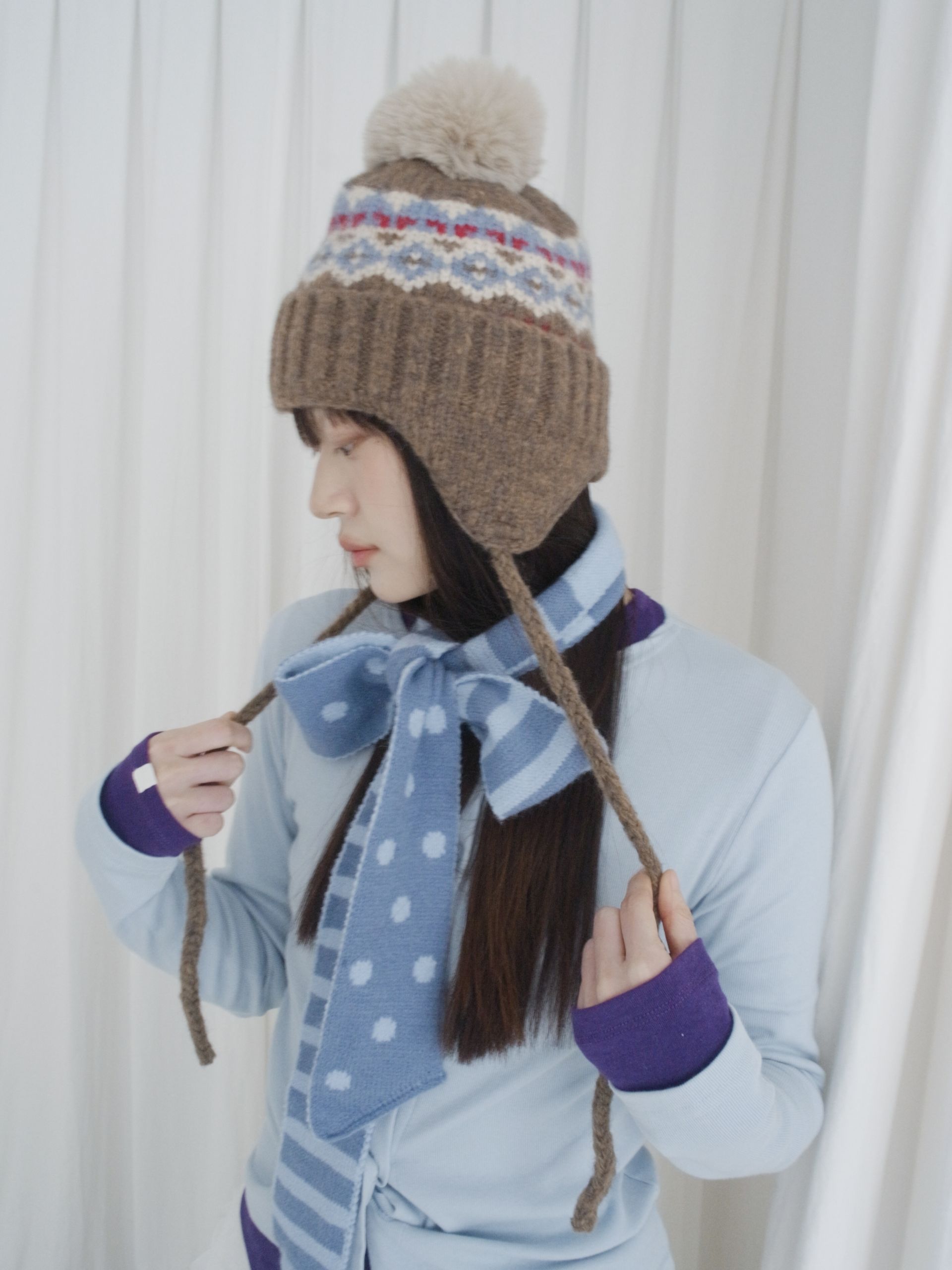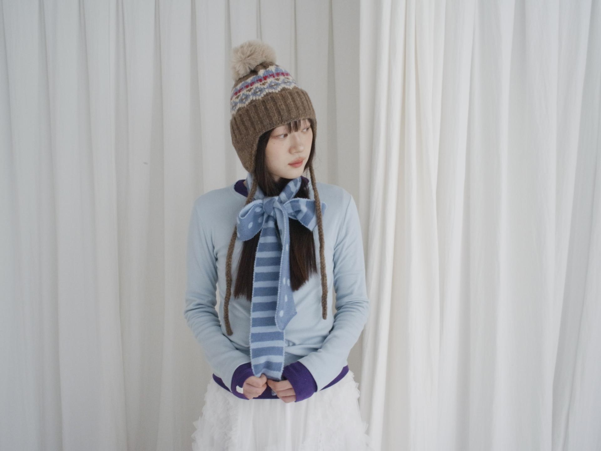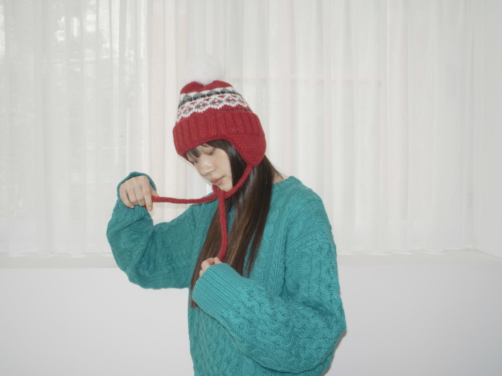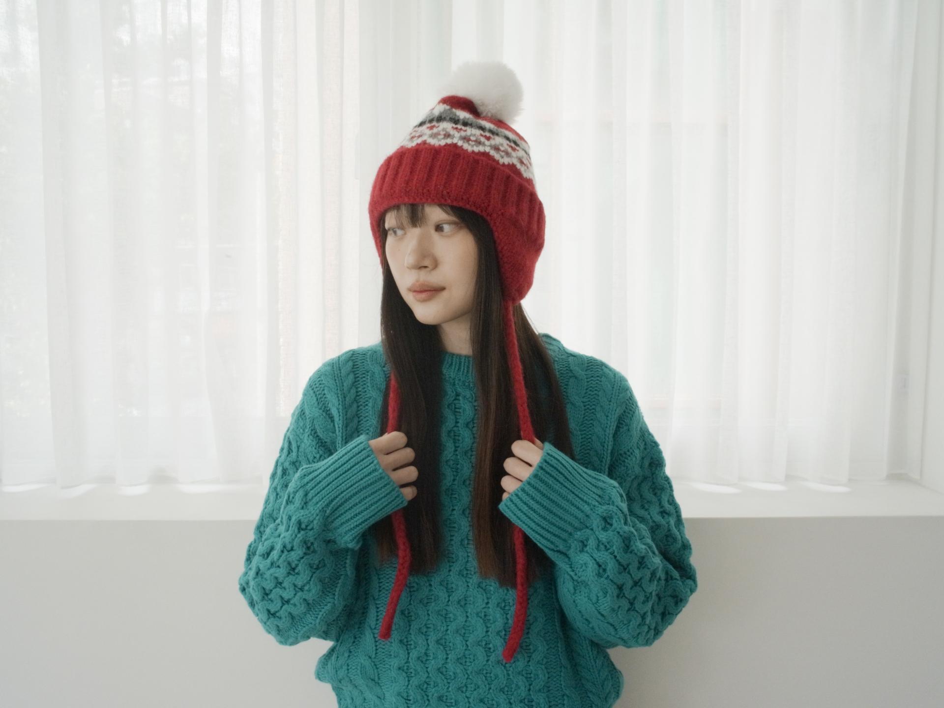 매 년 겨울에 유행 없이 착용하여 계절에 맞는 포인트 스타일링을 하기 좋은 아이템입니다. 양 옆의 끈은 모델처럼 푸르거나