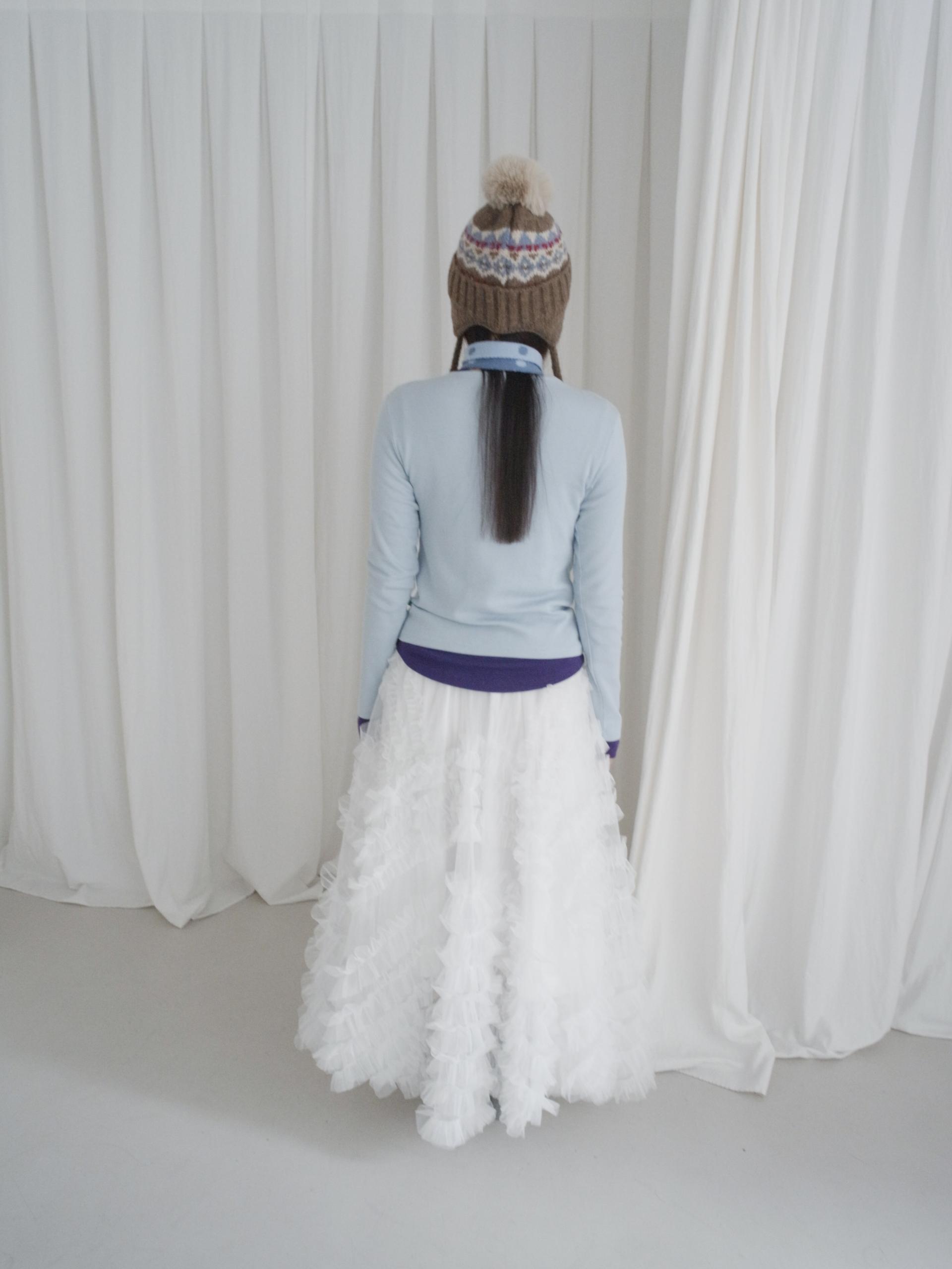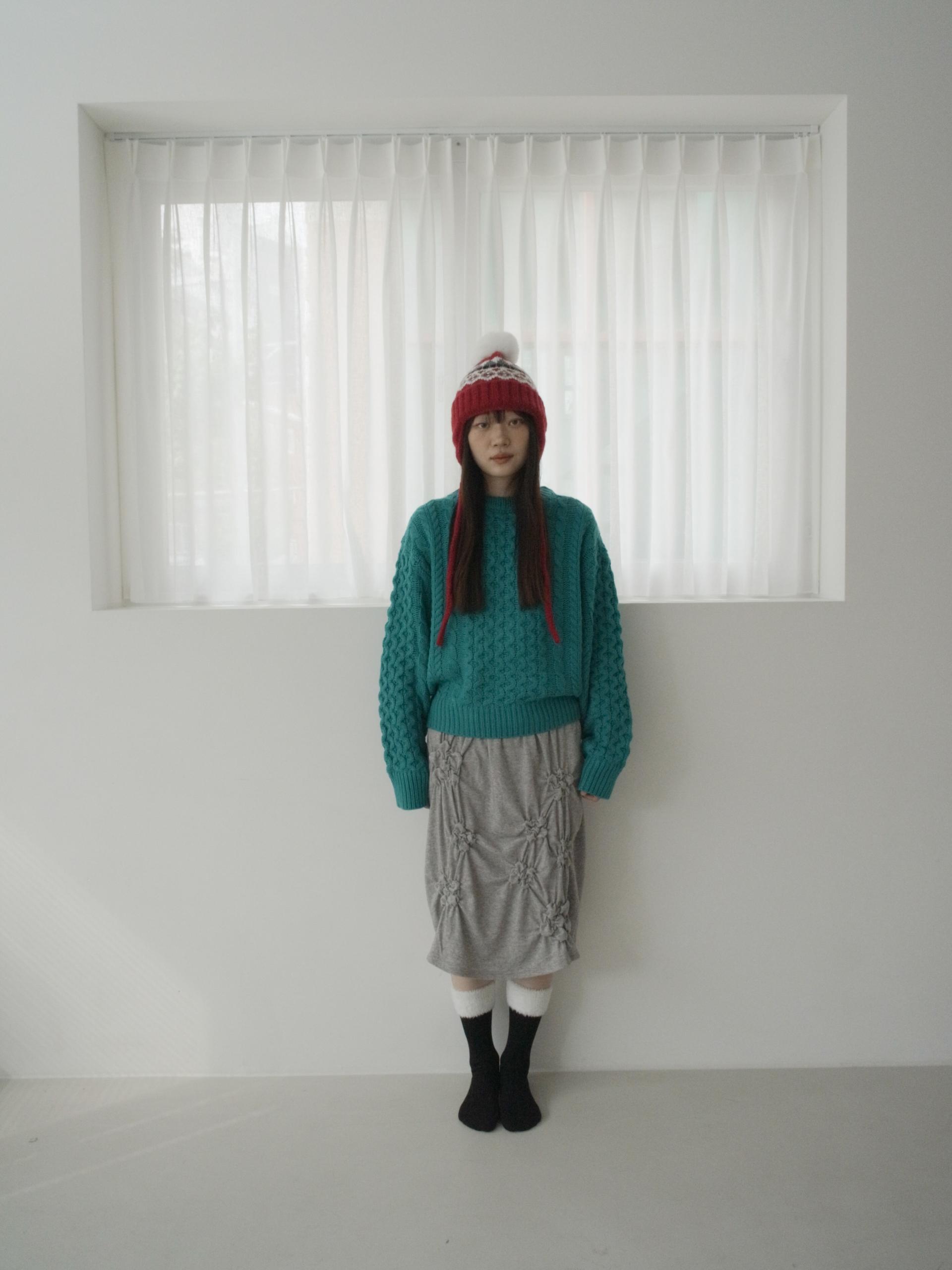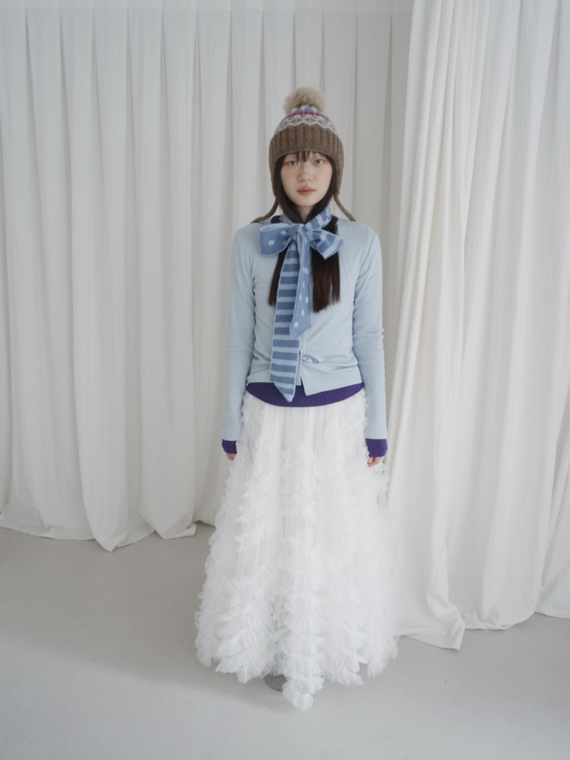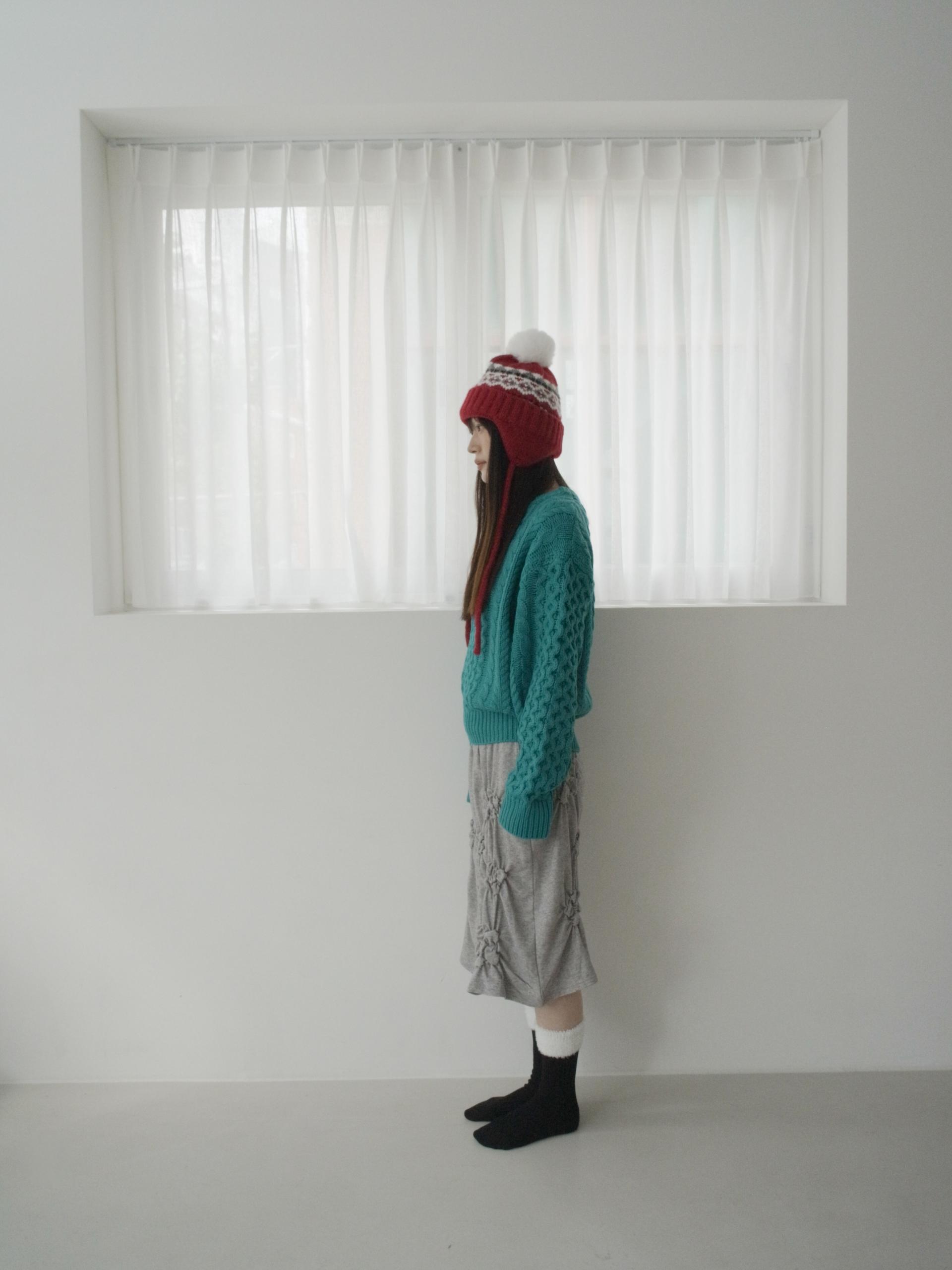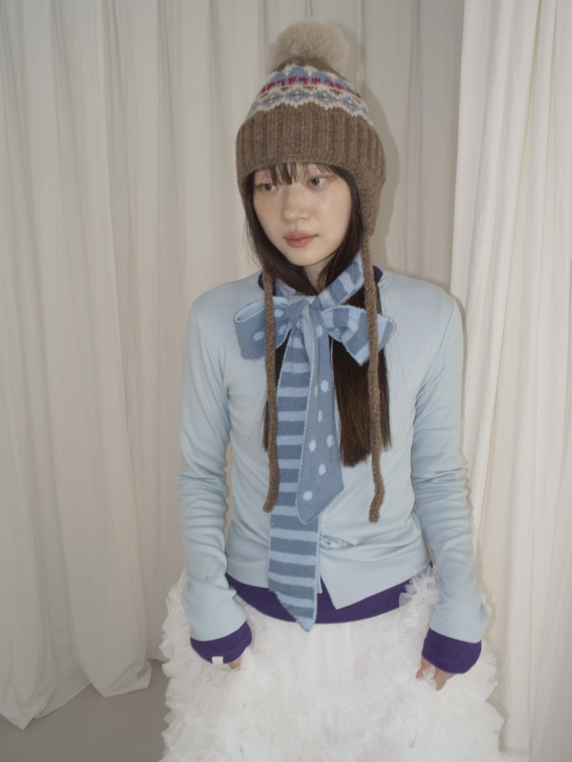 매 년 겨울에 유행 없이 착용하여 계절에 맞는 포인트 스타일링을 하기 좋은 아이템입니다. 양 옆의 끈은 모델처럼 푸르거나