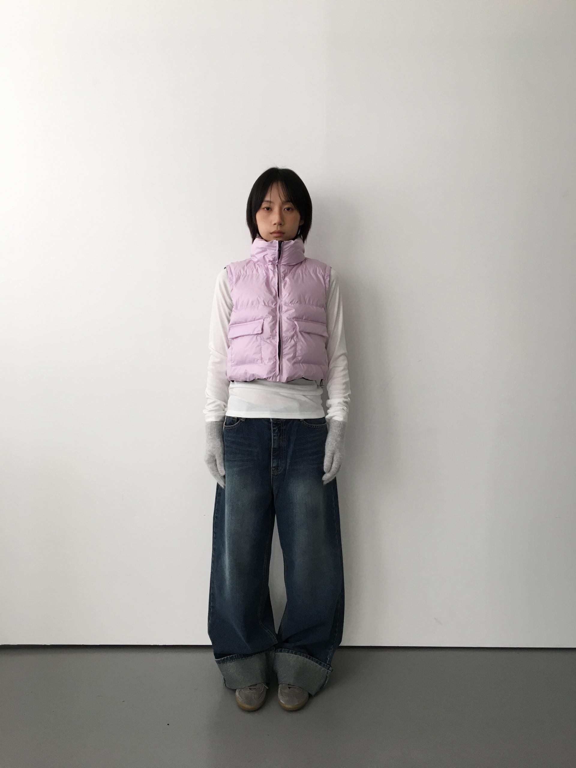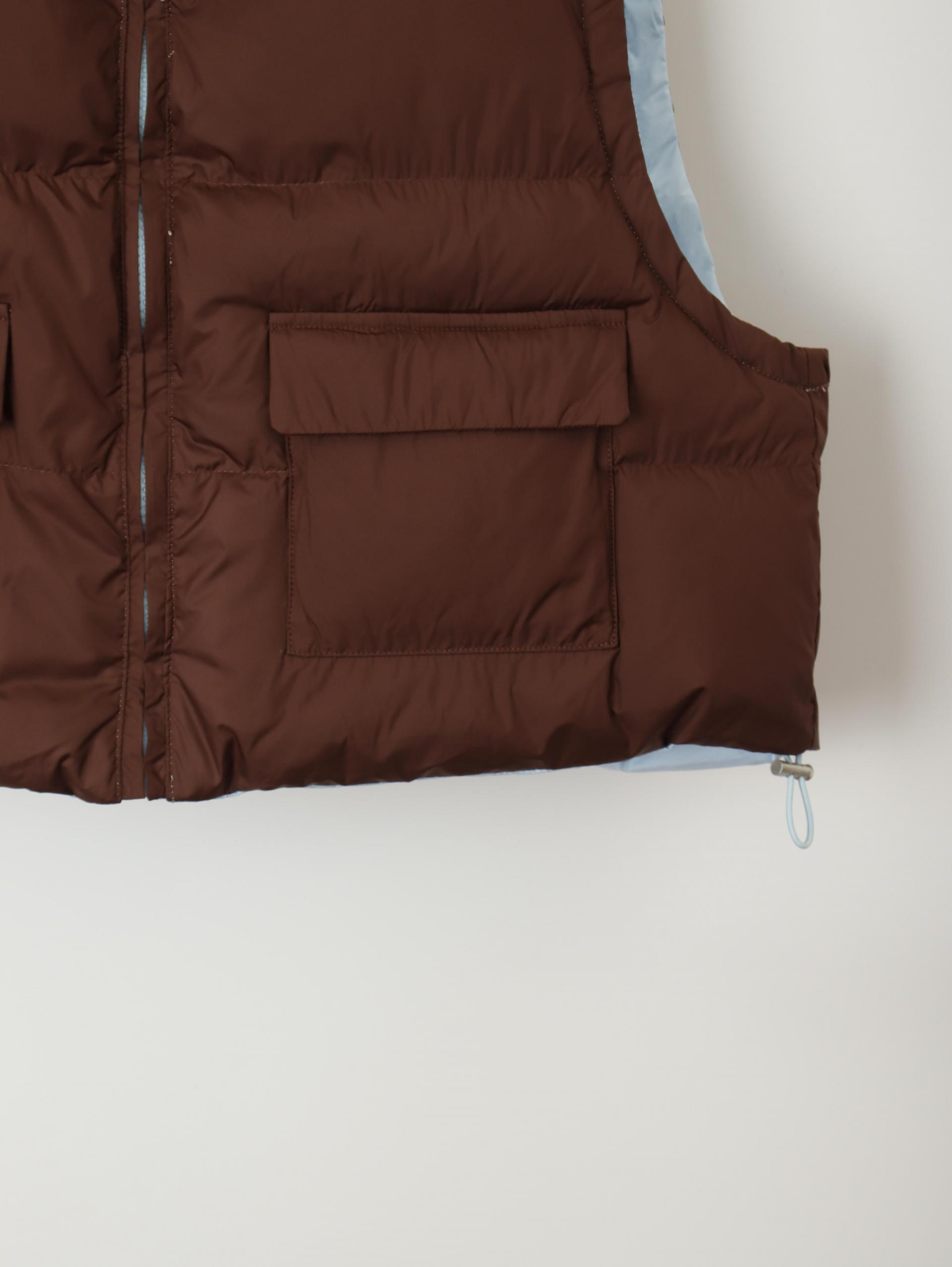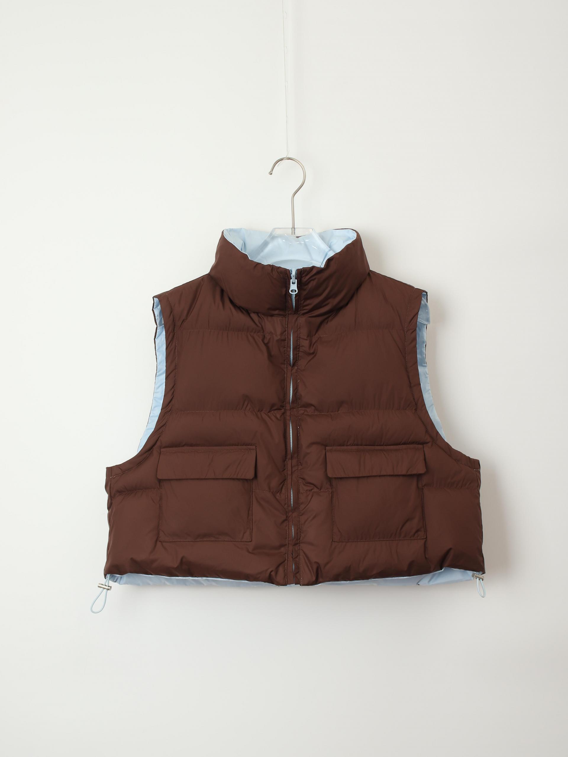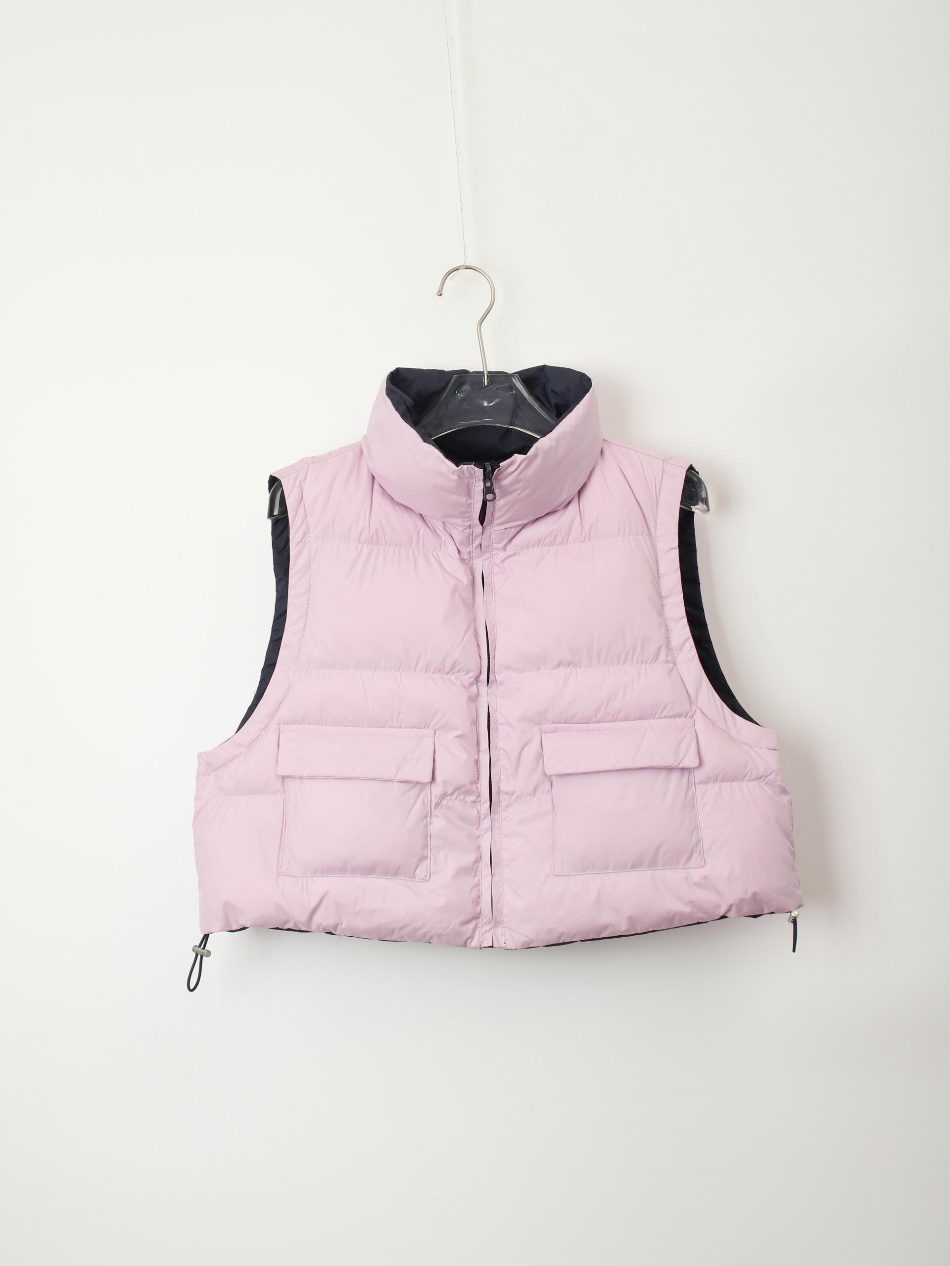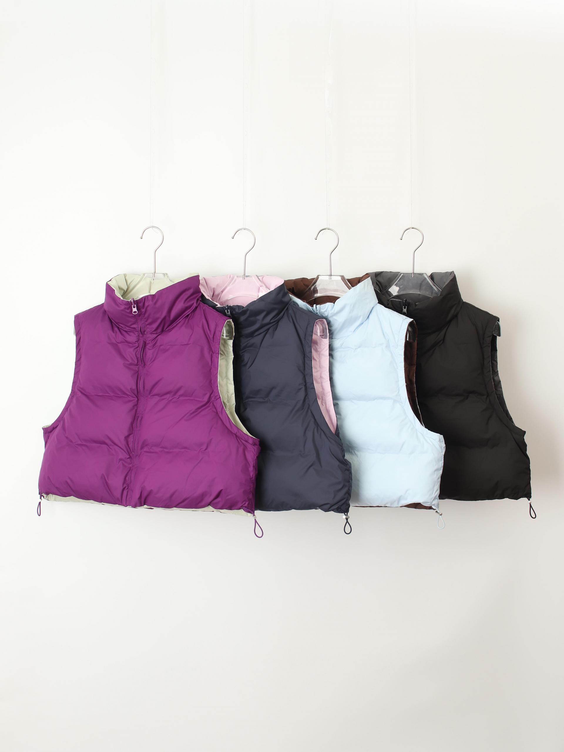 가볍고 따뜻한 데일리 패딩 베스트로, 겉감과 안감이 서로 다른 컬러로 구성된 배색 디테일이 포인트입니다.