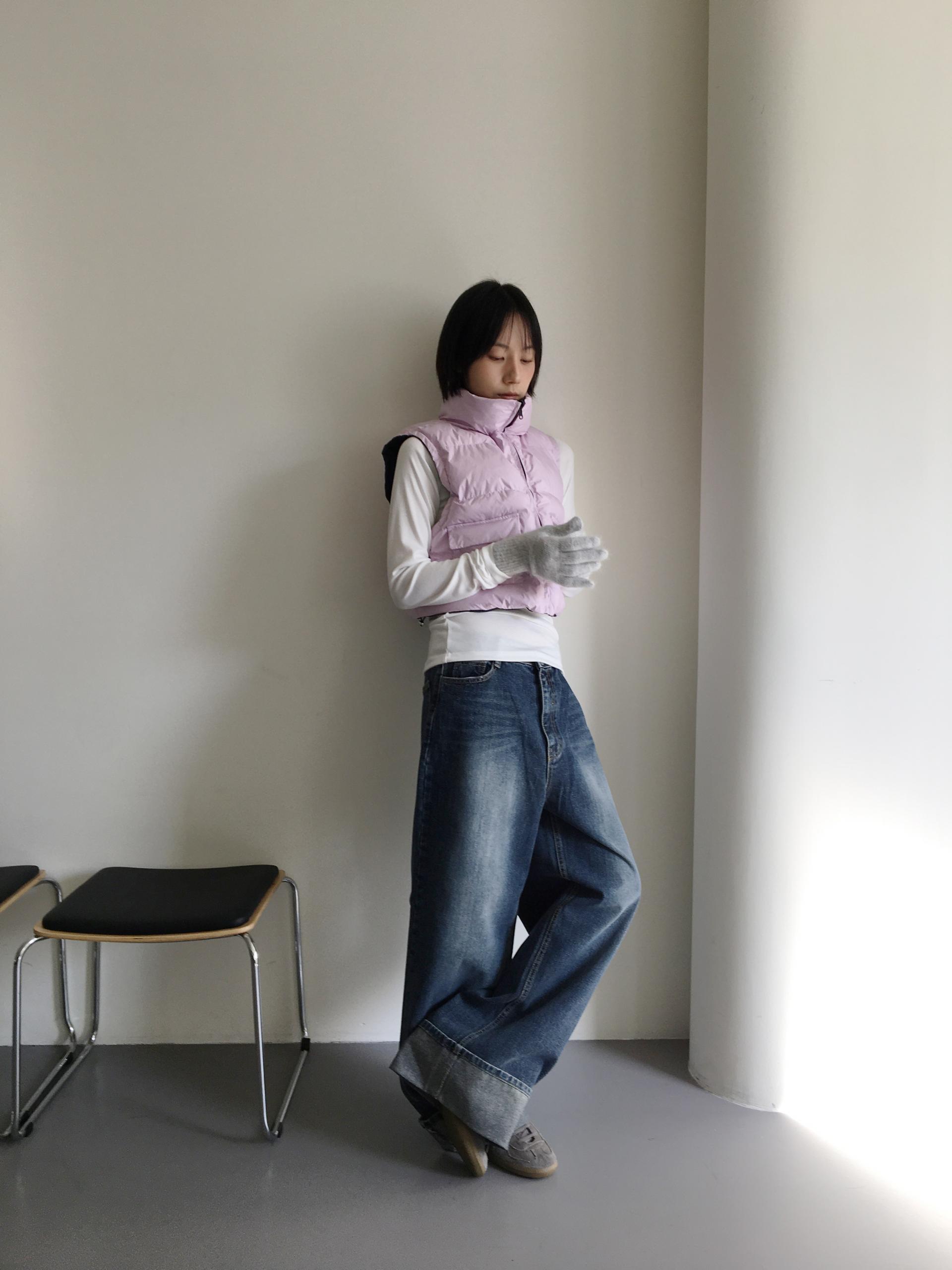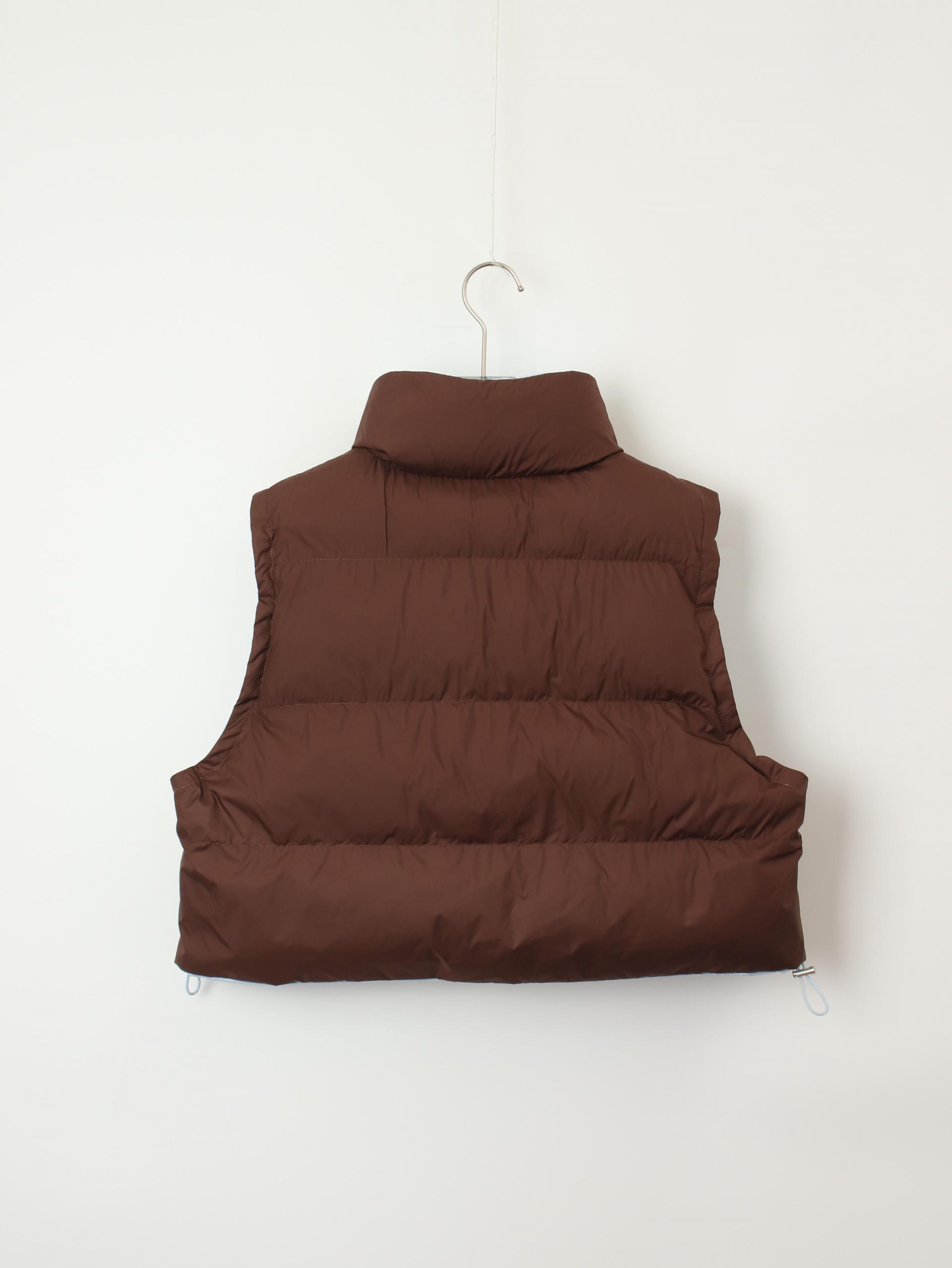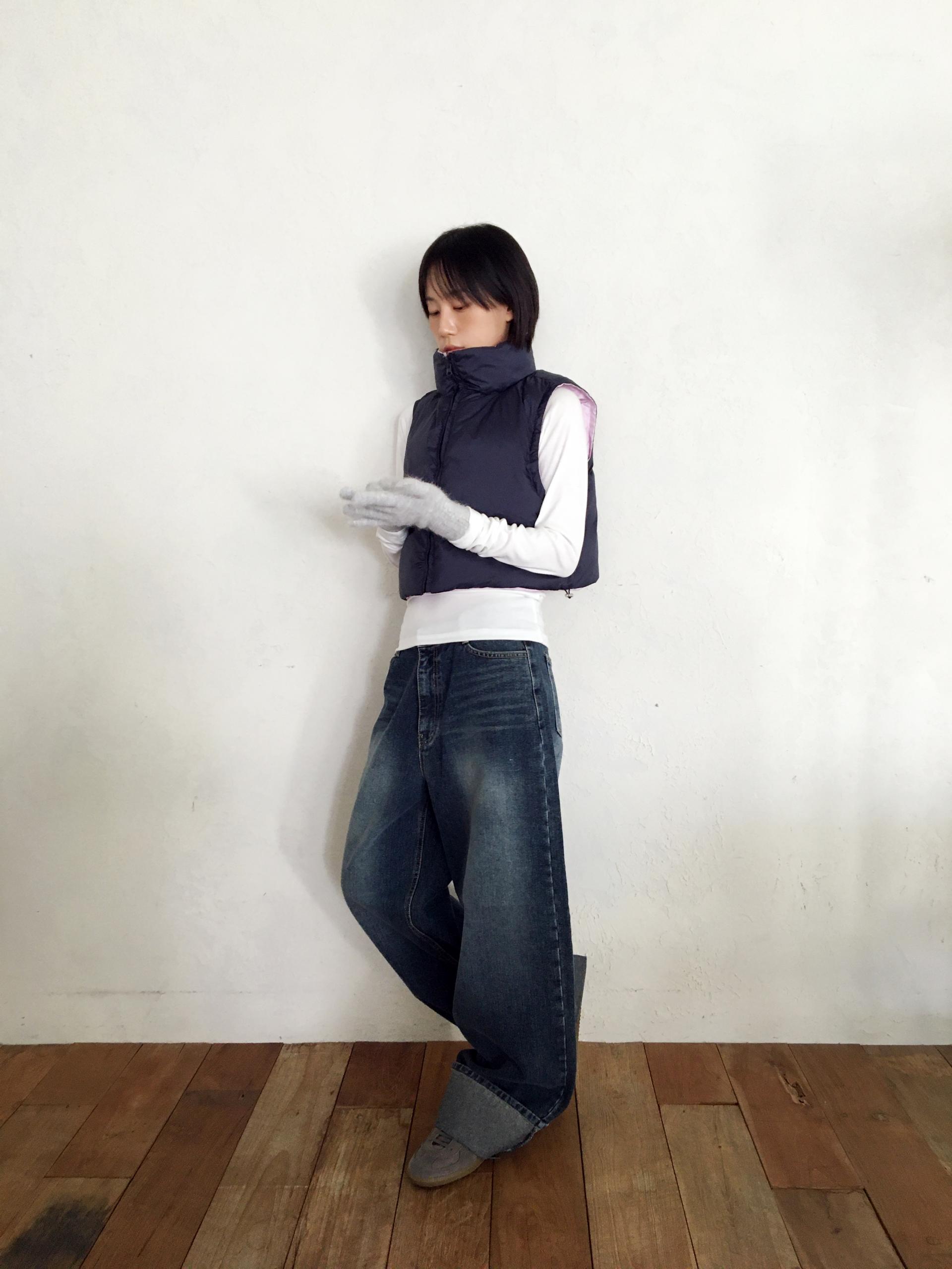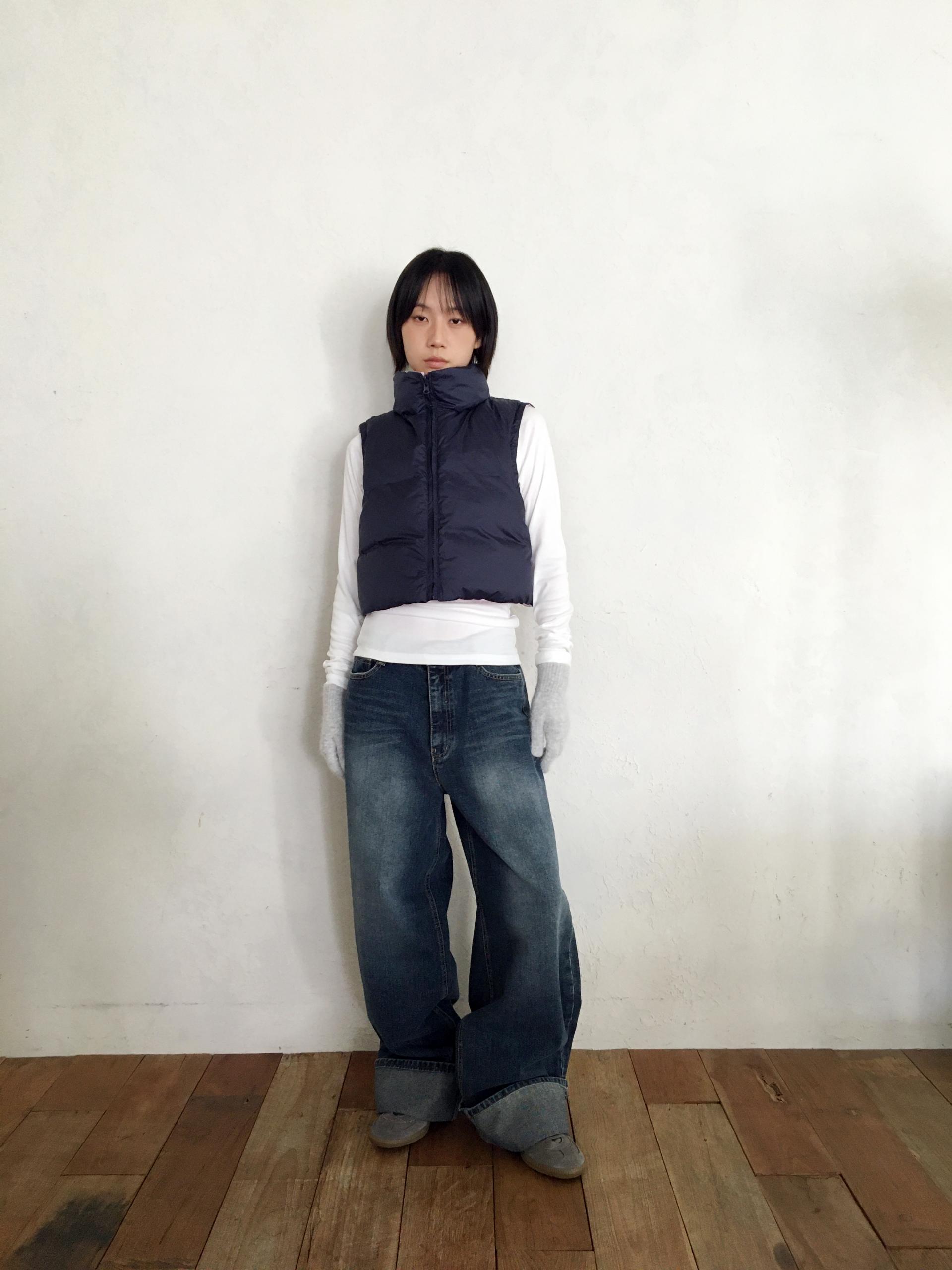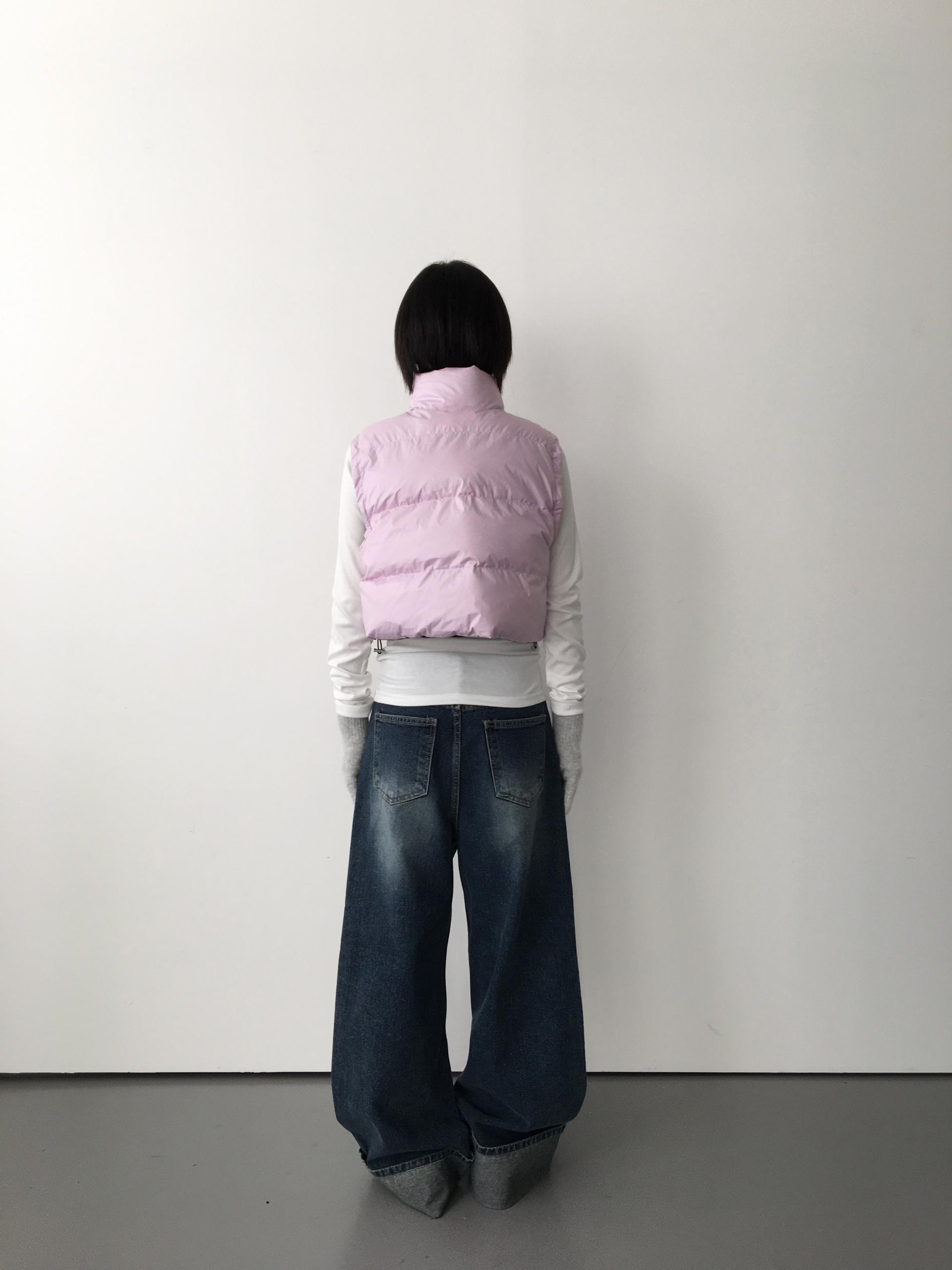 가볍고 따뜻한 데일리 패딩 베스트로, 겉감과 안감이 서로 다른 컬러로 구성된 배색 디테일이 포인트입니다.
