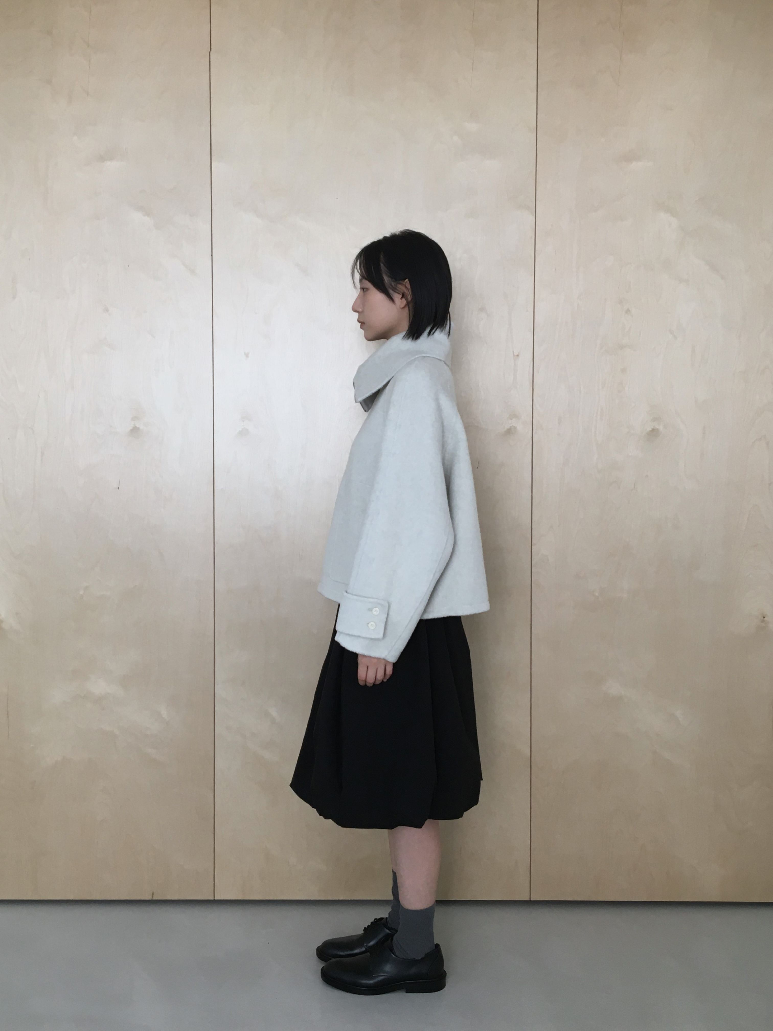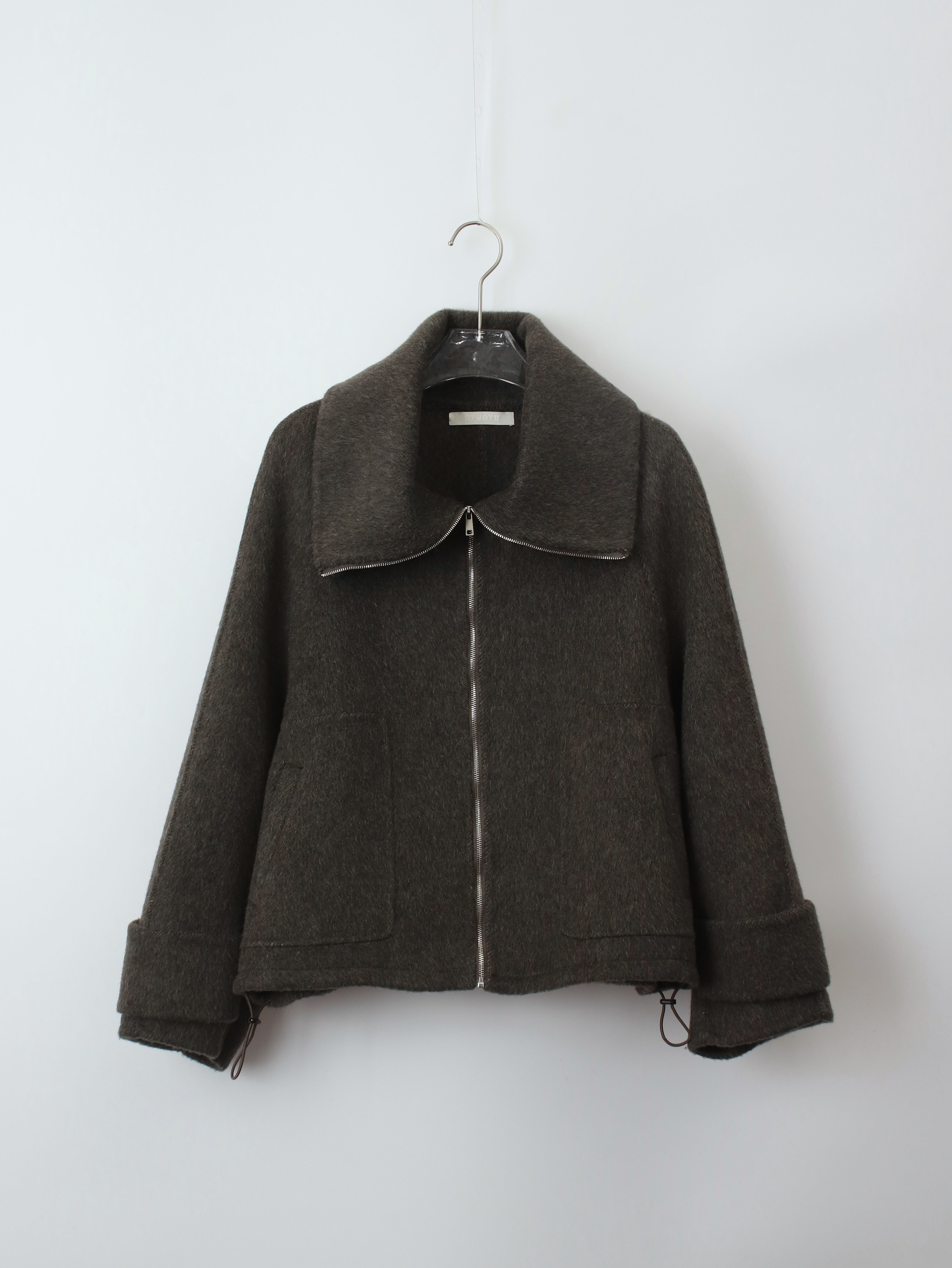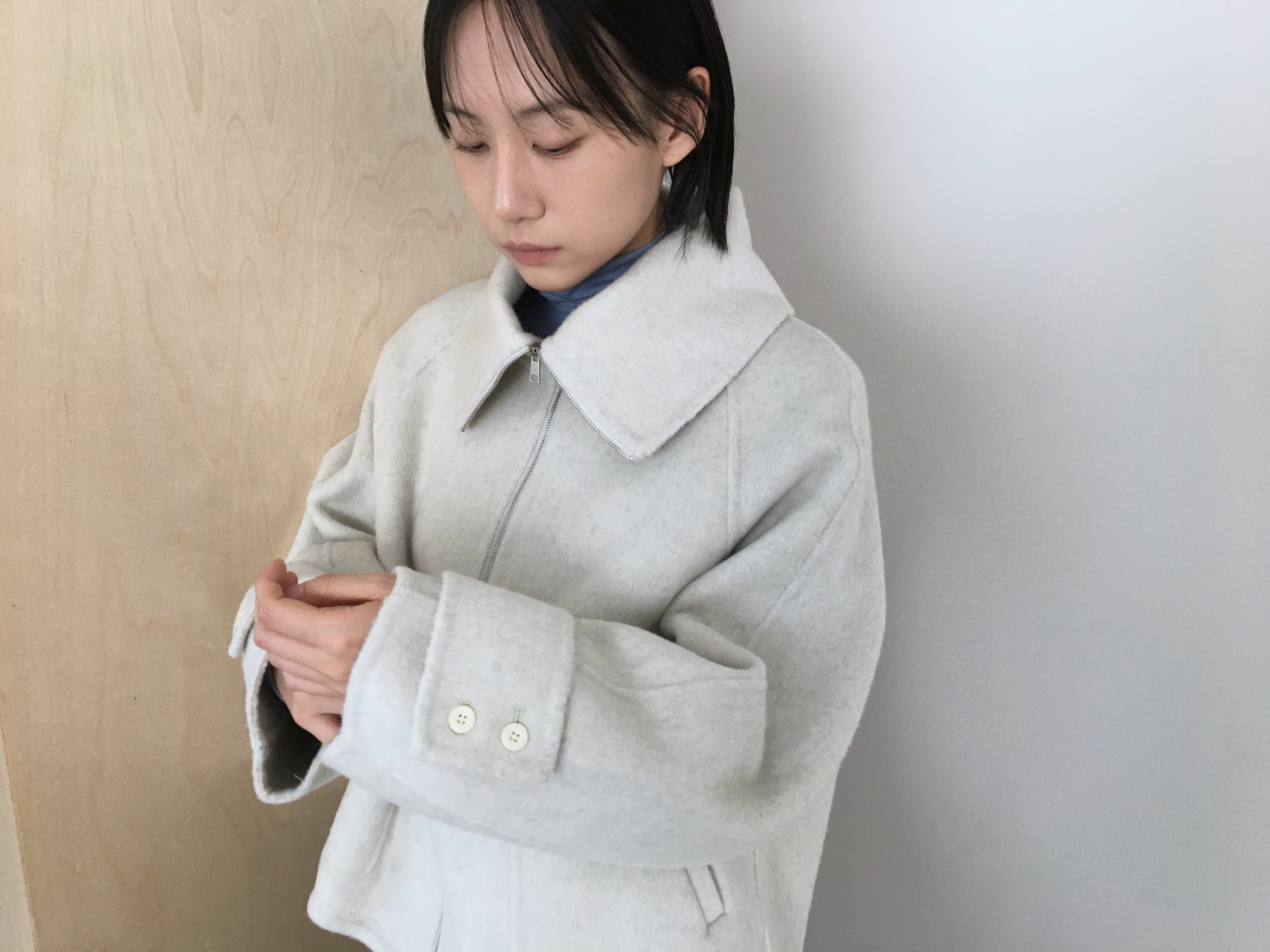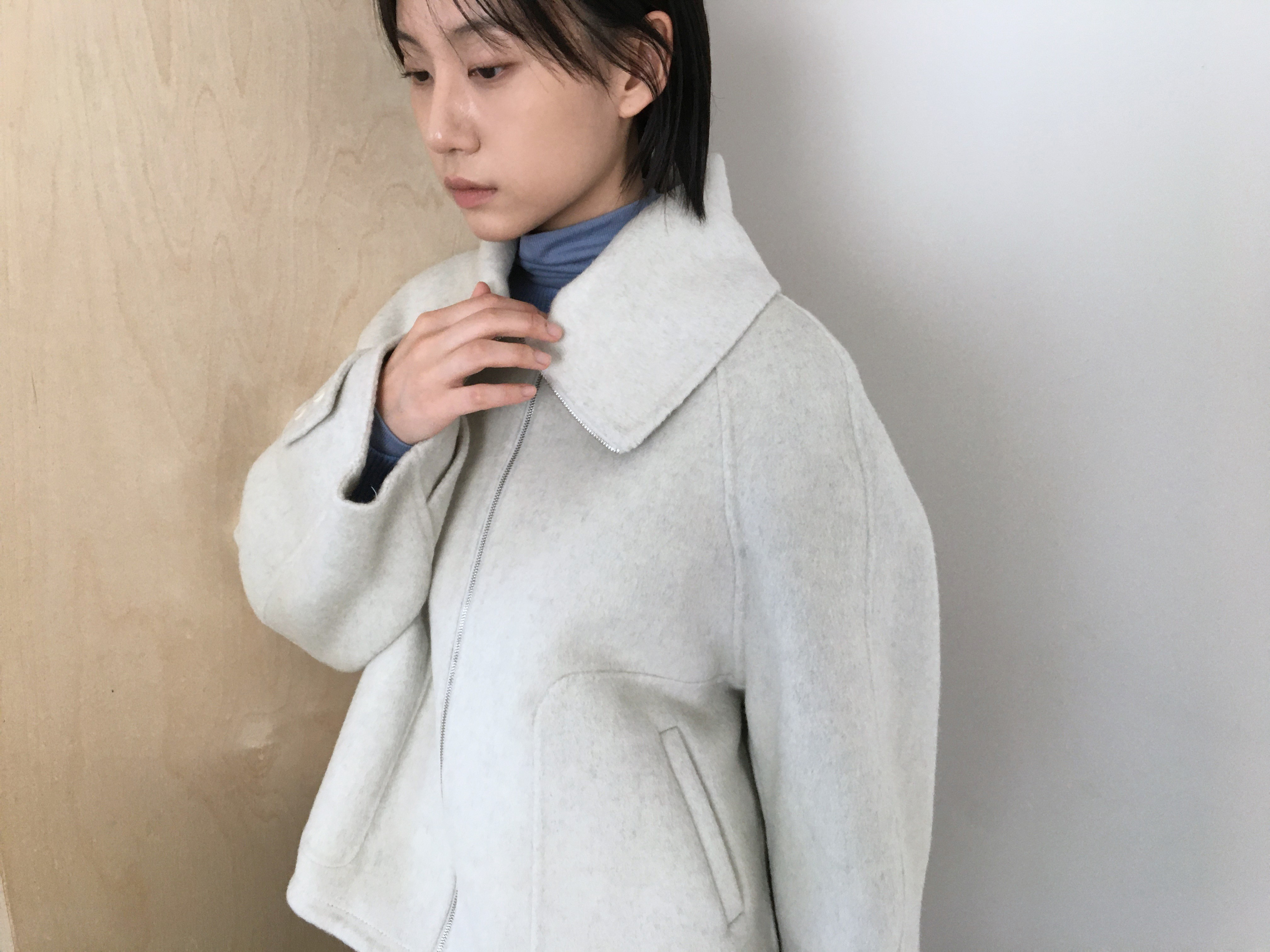 투웨이 넥카라 연출이 가능한 숏한 기장의 코트 집업 입니다.