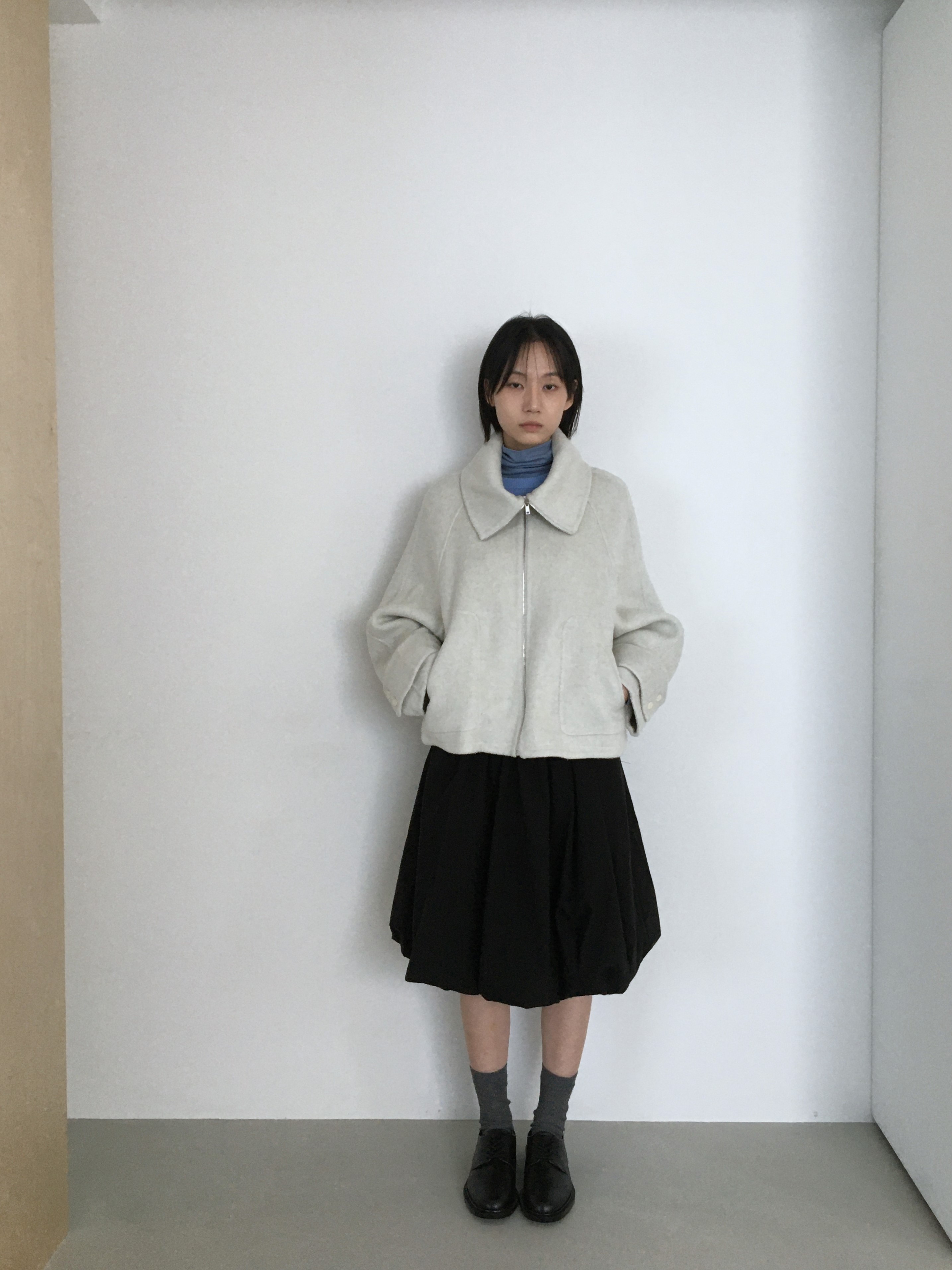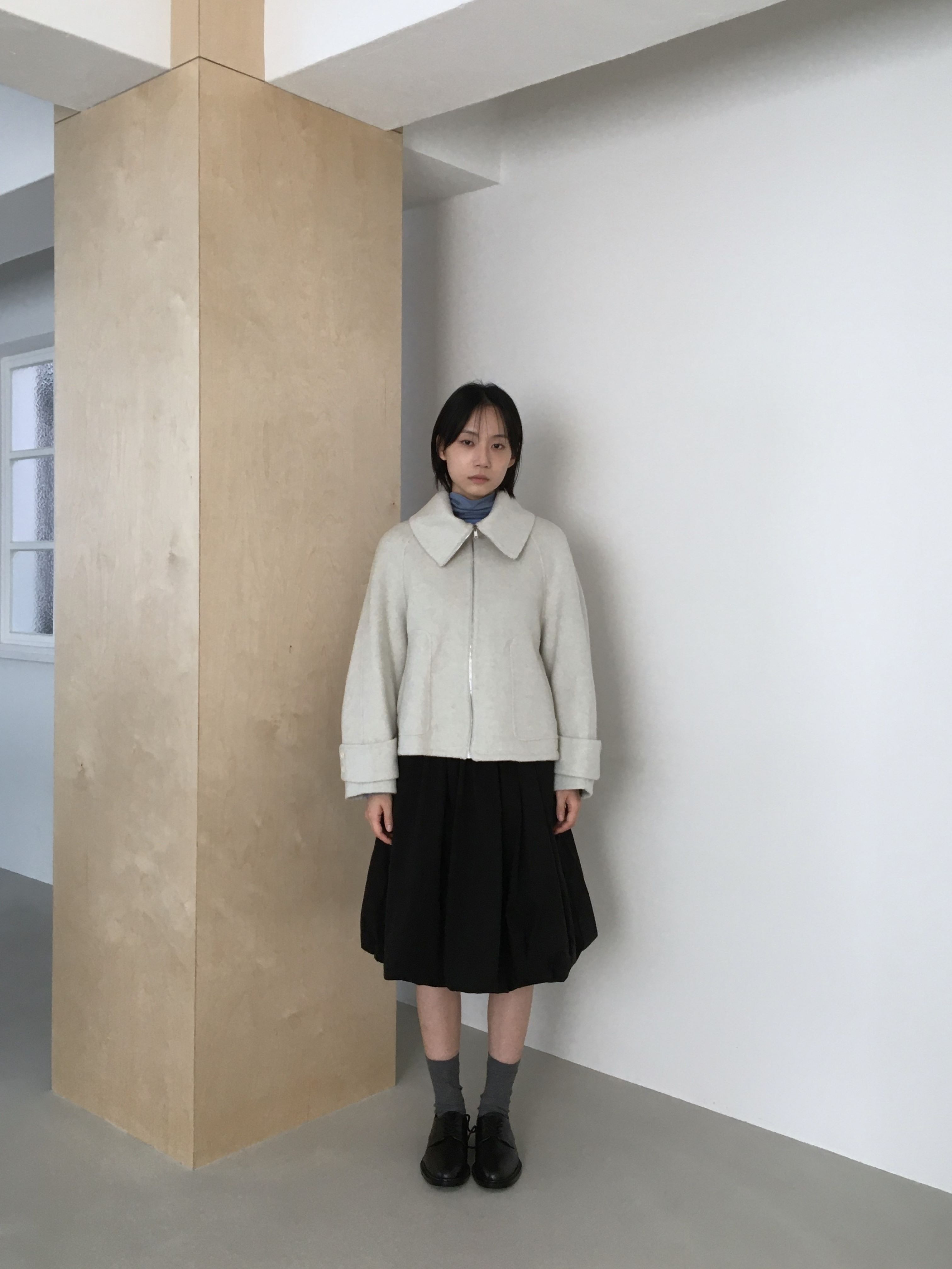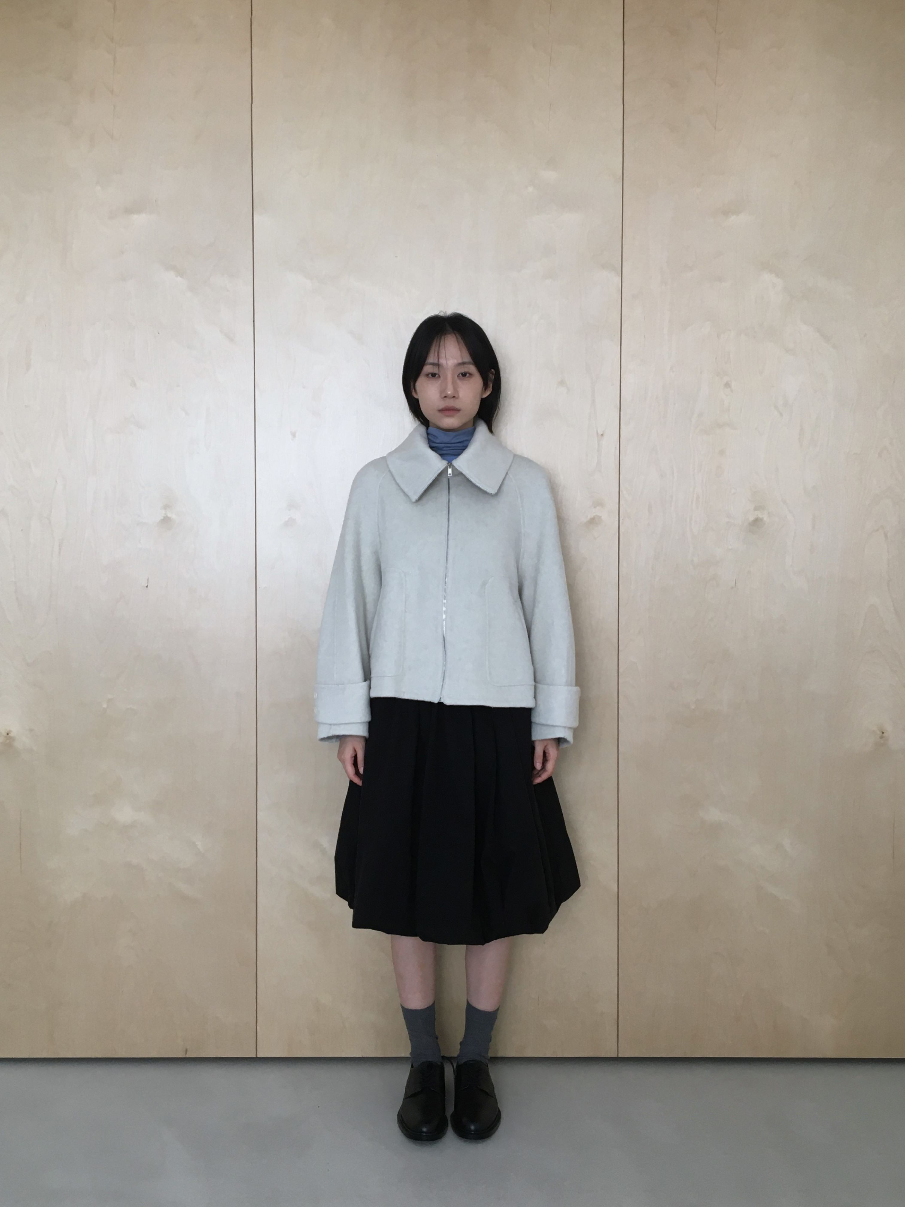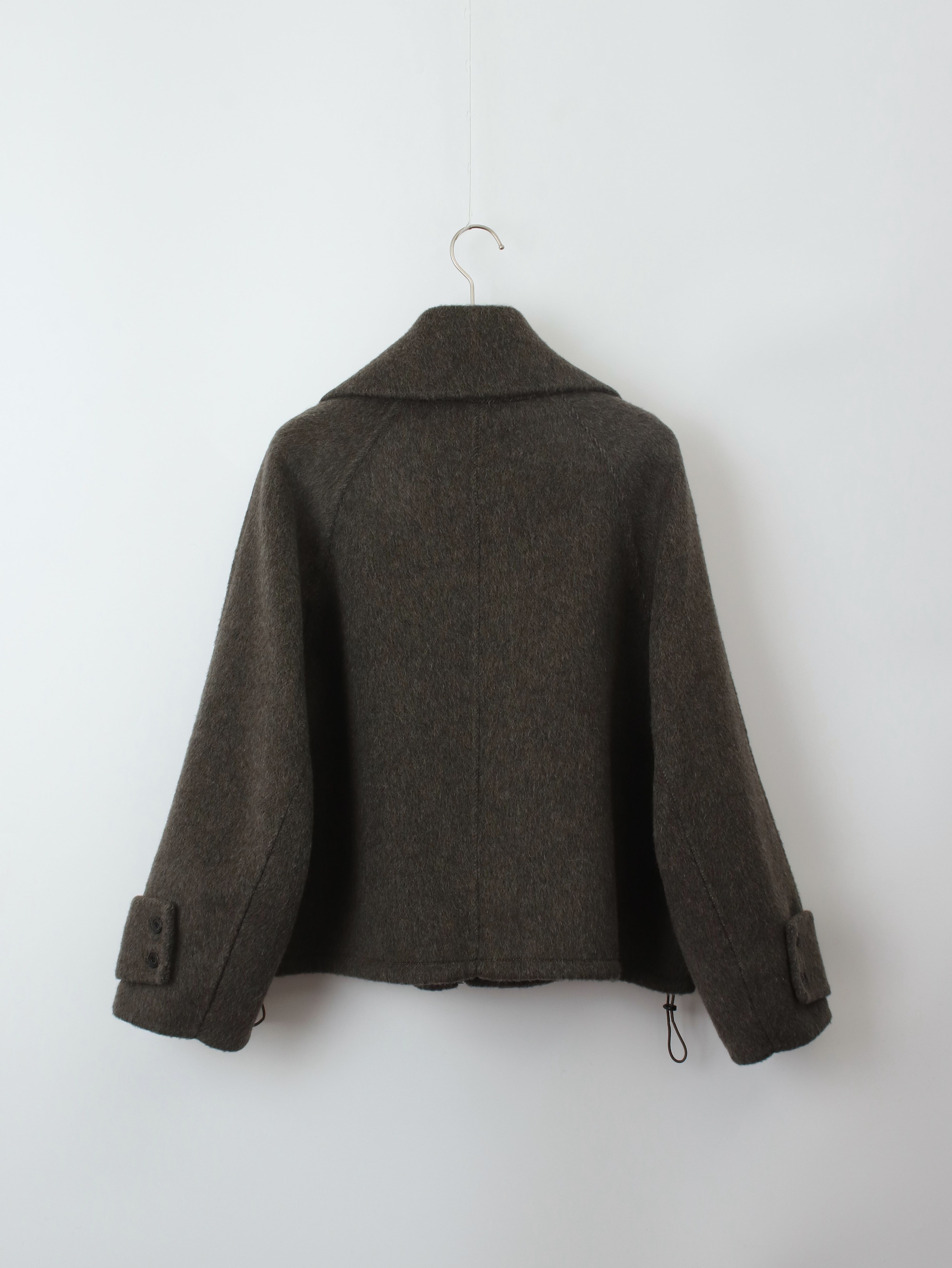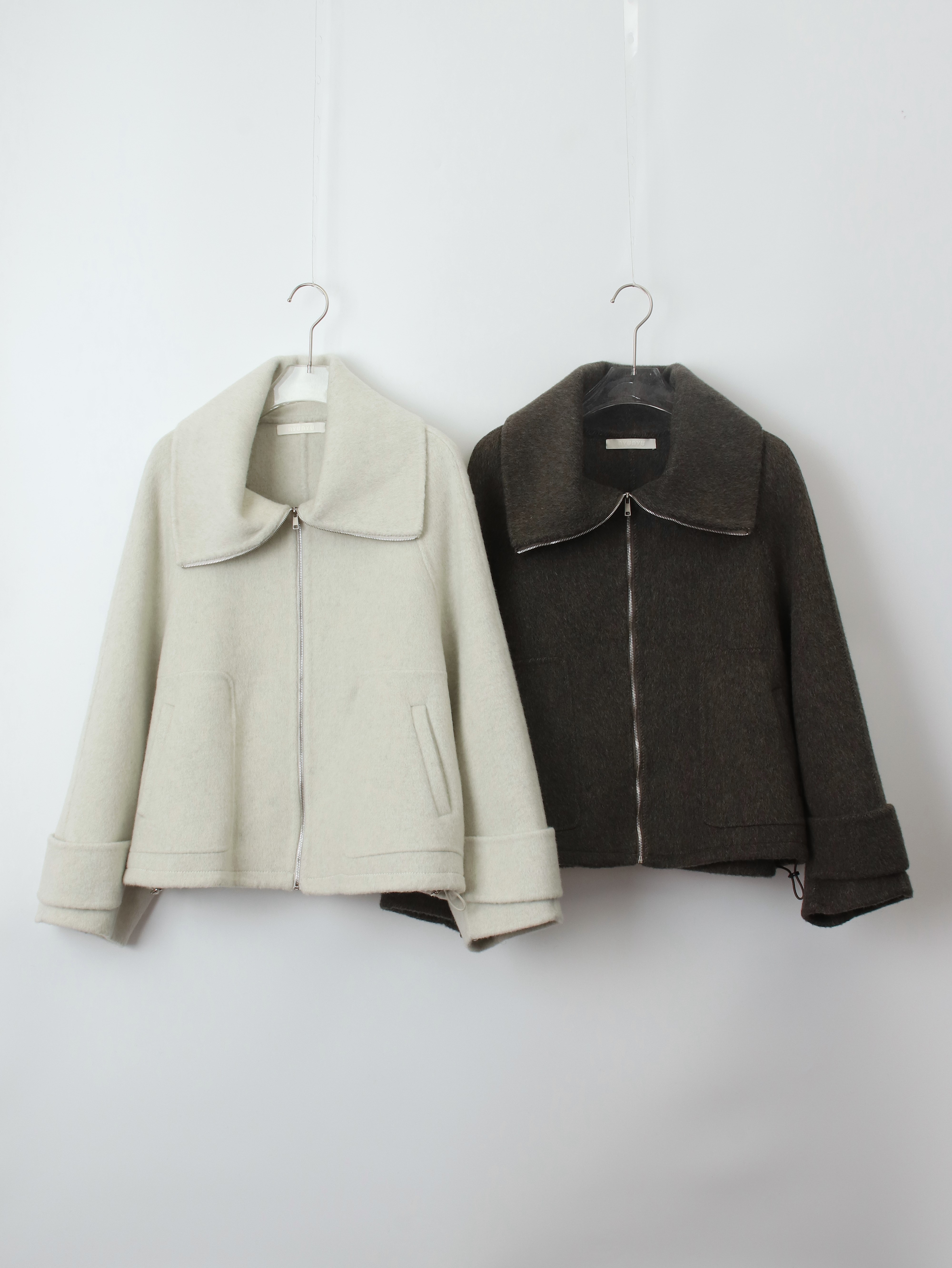 투웨이 넥카라 연출이 가능한 숏한 기장의 코트 집업 입니다.