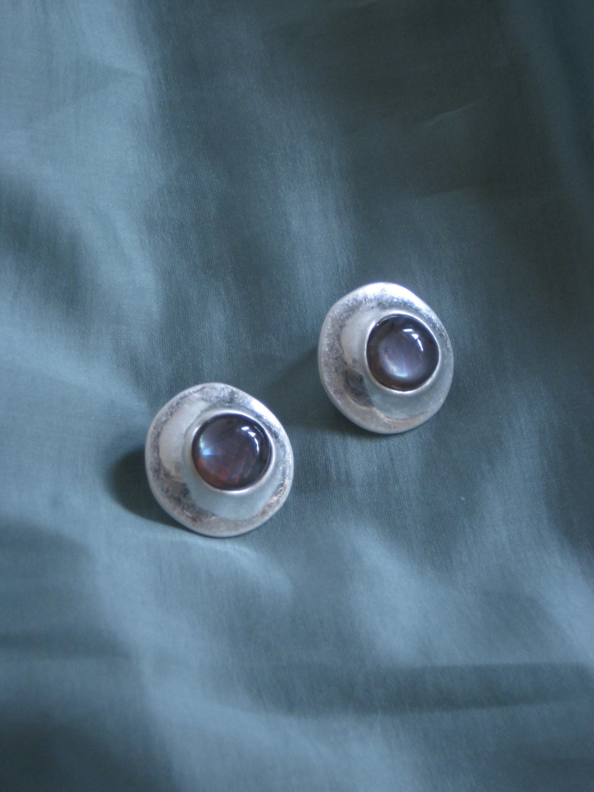 - 원형 실버 프레임과 딥 컬러 포인트의 이어링