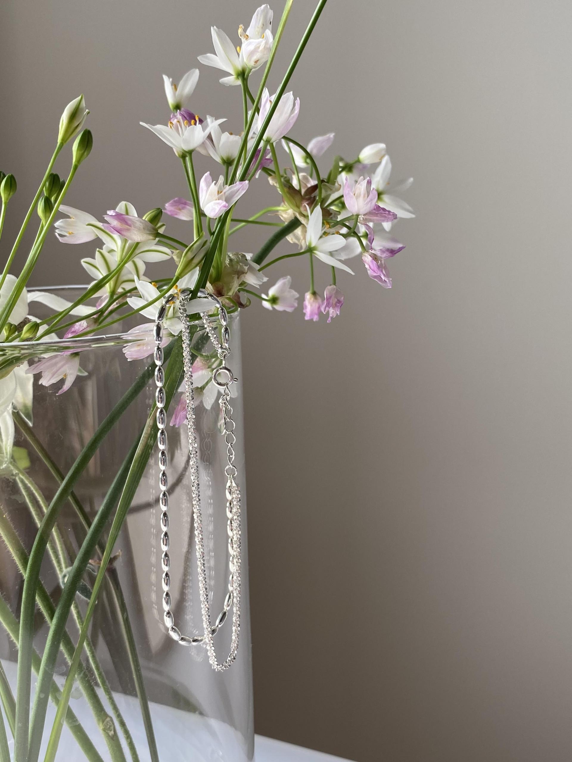 긴 타원형의 은볼 체인과 은은하게 빛나는 꼬임 체인 두 줄로 셋팅된